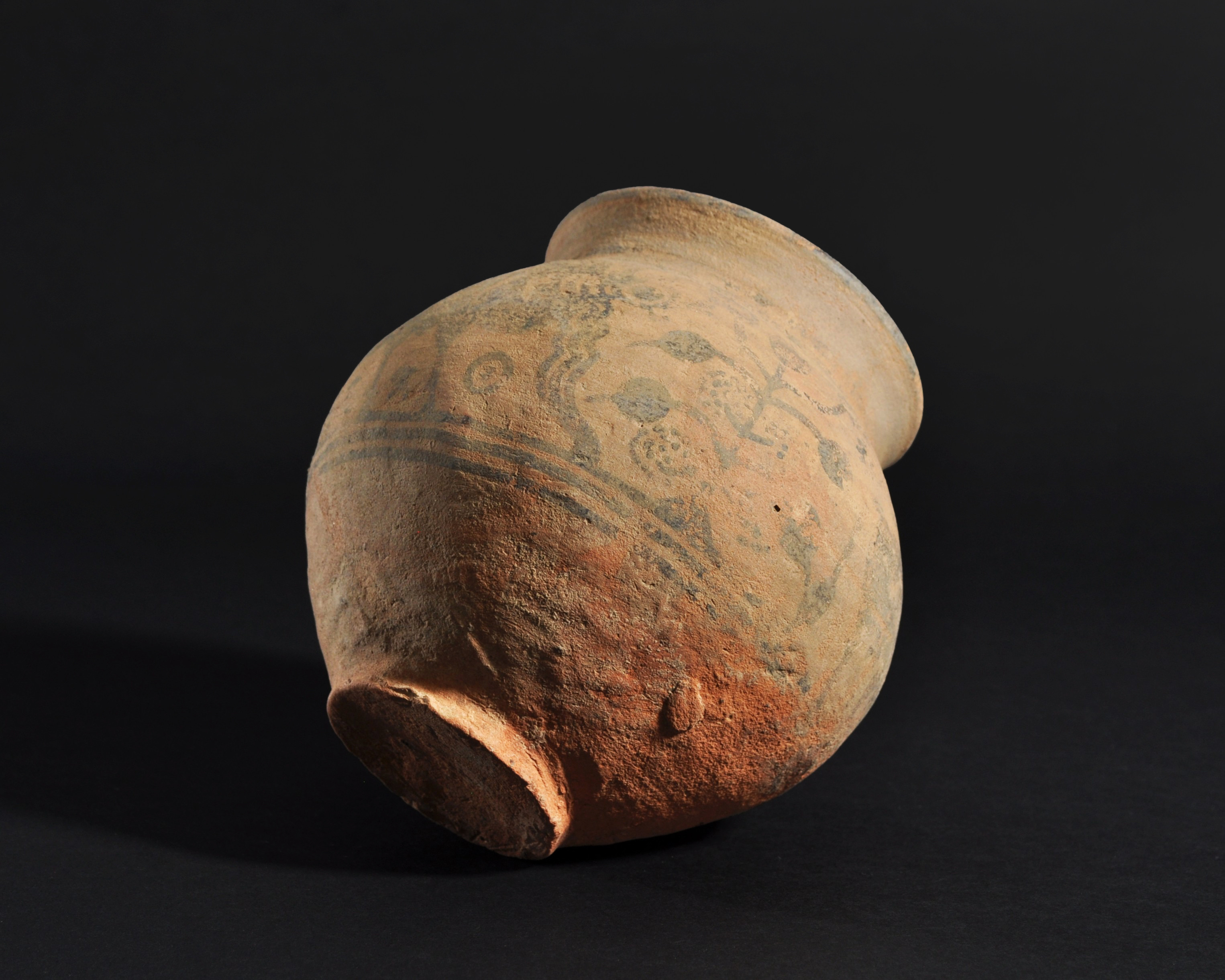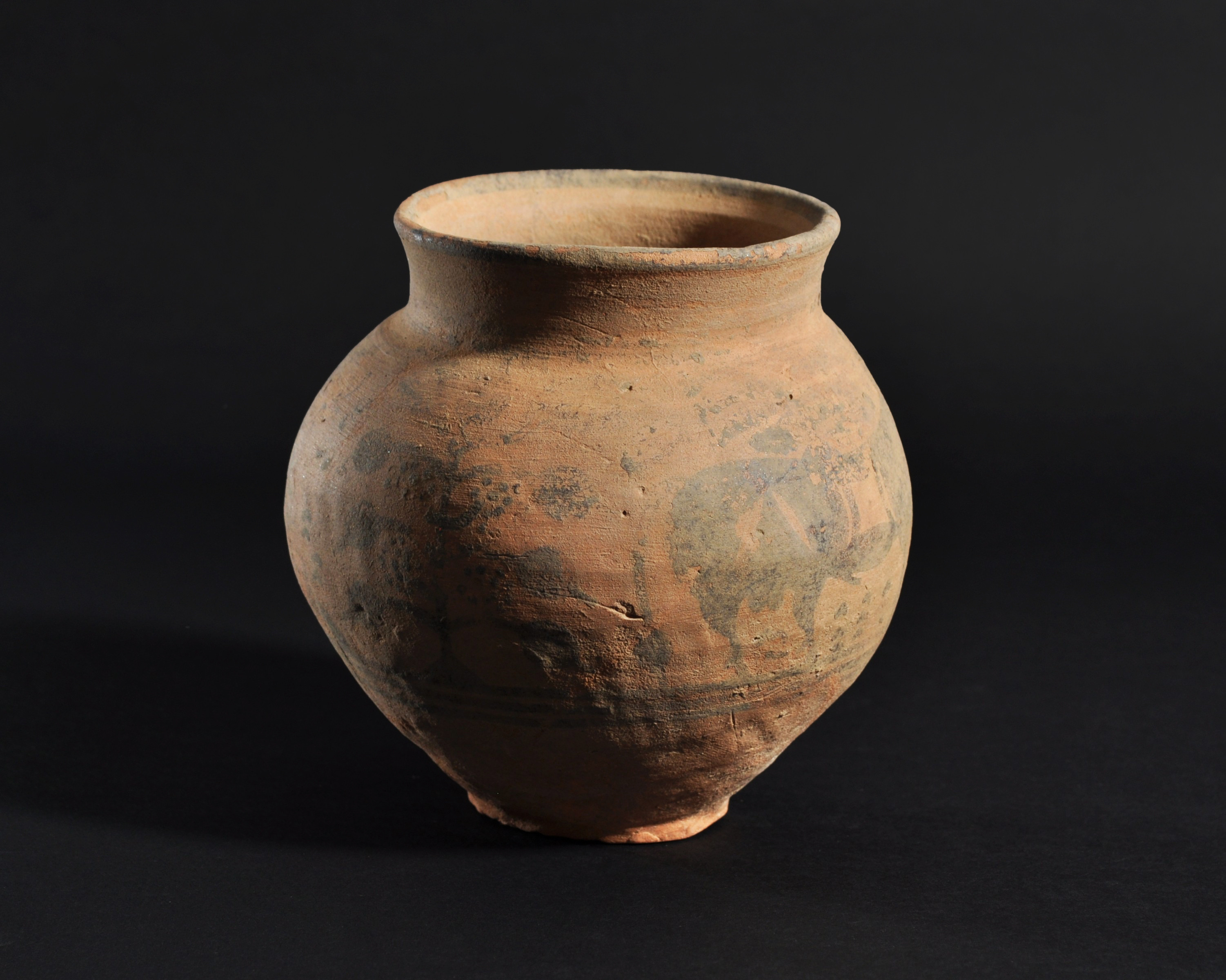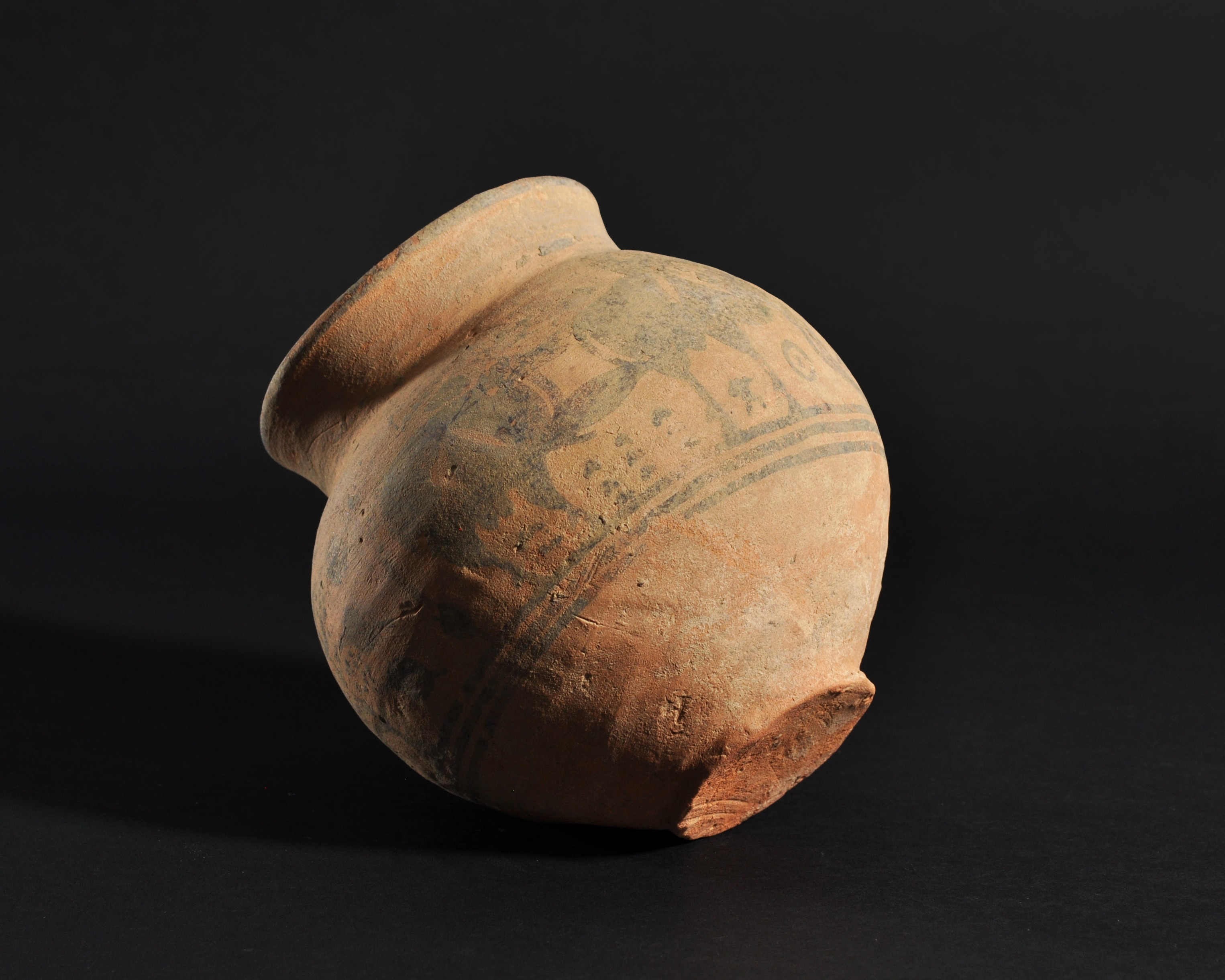 ARQUEOLOGÍA. MEDIO ORIENTE. Valle del Indo. Vasija con decoración pintada de cuadrúpedos entre vegetación (III-II milenio a.C.). Cerámica. Altura 14 cm. Presenta faltas pictóricas.