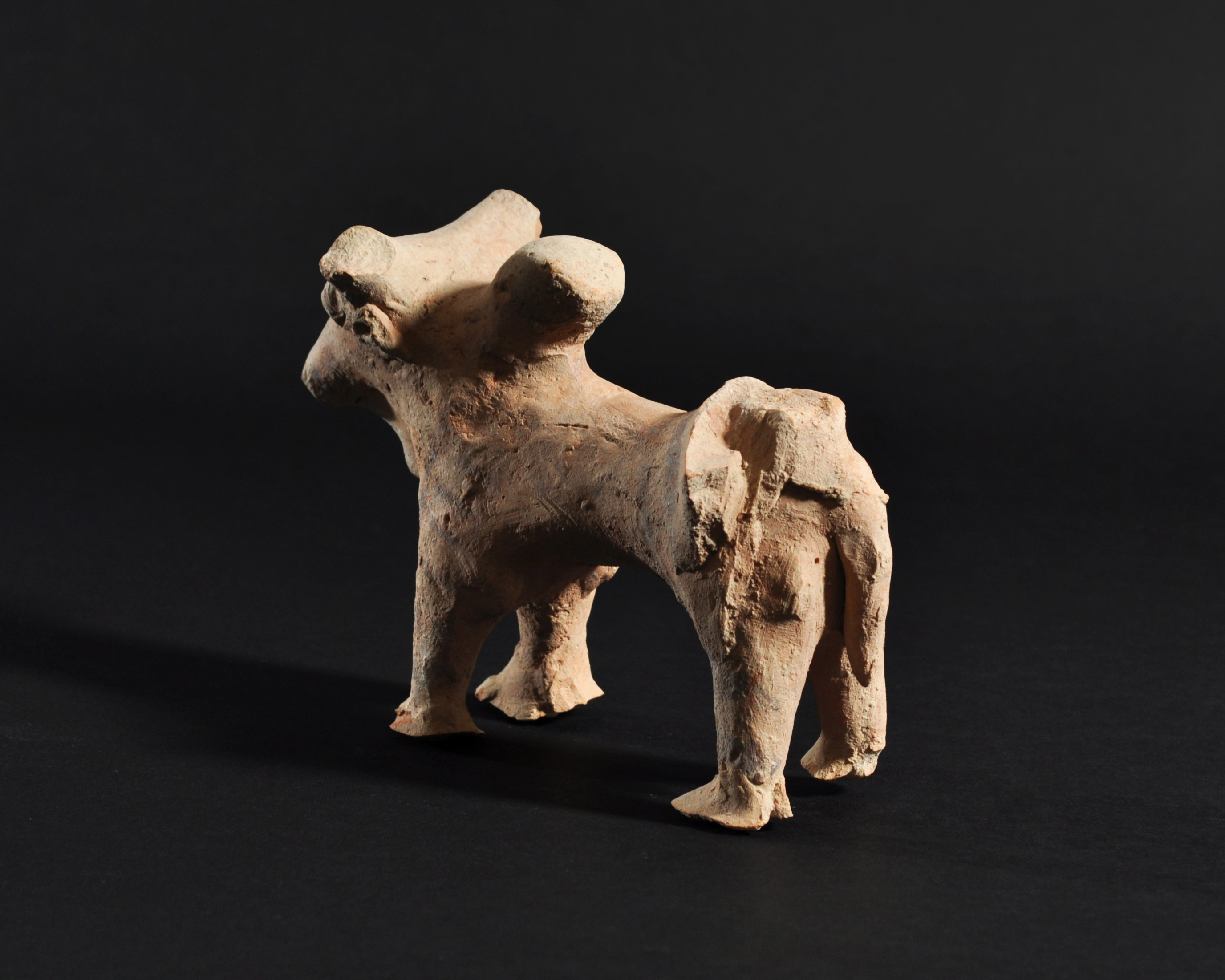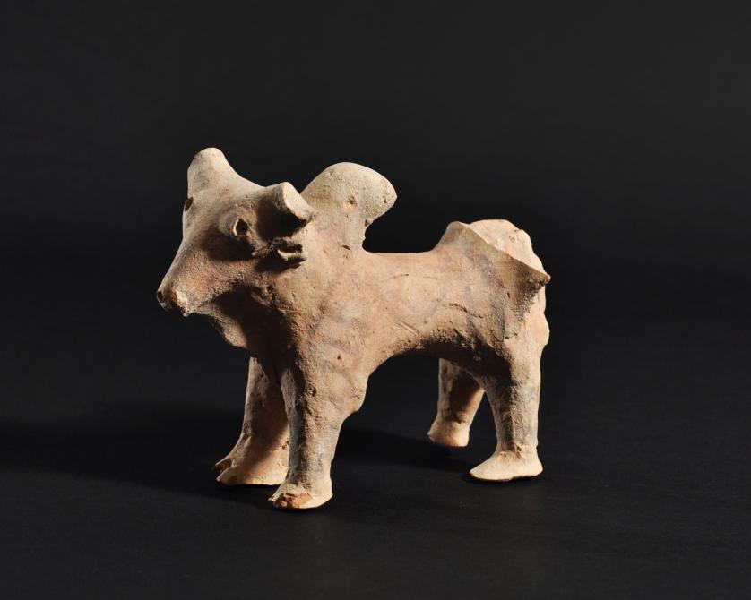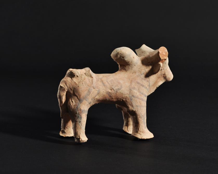 ARQUEOLOGÍA. MEDIO ORIENTE. Valle del Indo. Cultura Mehrgar. Figura de cebú con decoración pintada (ca. 2000 a.C.). Cerámica. Longitud 14,5 cm. Presenta faltas. Adjunta certificado de termoluminiscencia QED Laboratoire. Solo envío a España.