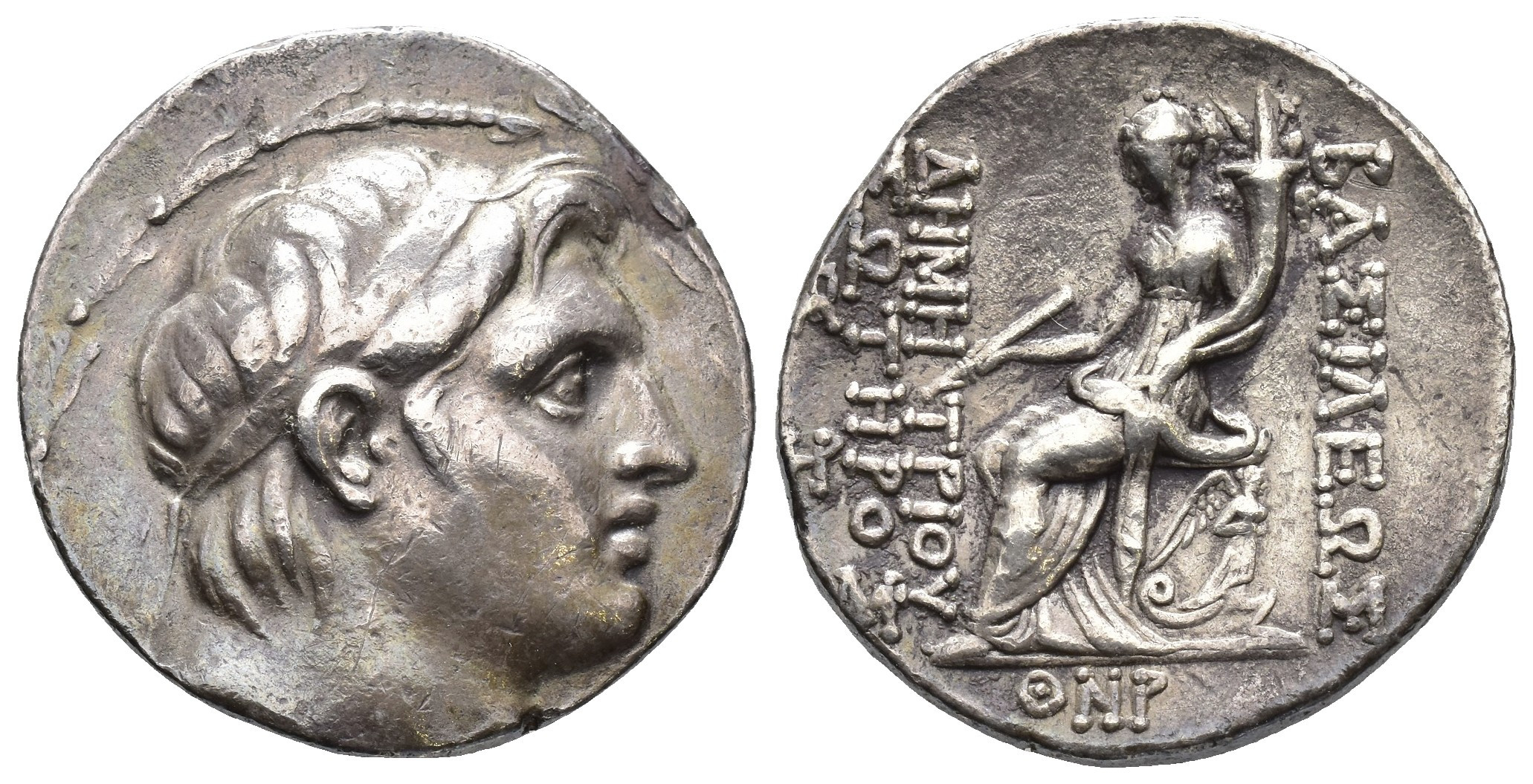 GRECIA ANTIGUA. REYES SELÉUCIDAS. Demetrio I (162-150 a.C.). Antioquía del Orontes. Tetradracma. A/ Cabeza diademada a der., alrededor láurea. R/ Tyche entronizada a der. con cetro y cornucopia, delante dos monogramas, exergo QNP. AR 16,54 g. 27,4 mm. COP-235 var. Anv. algo descentrado. MBC.