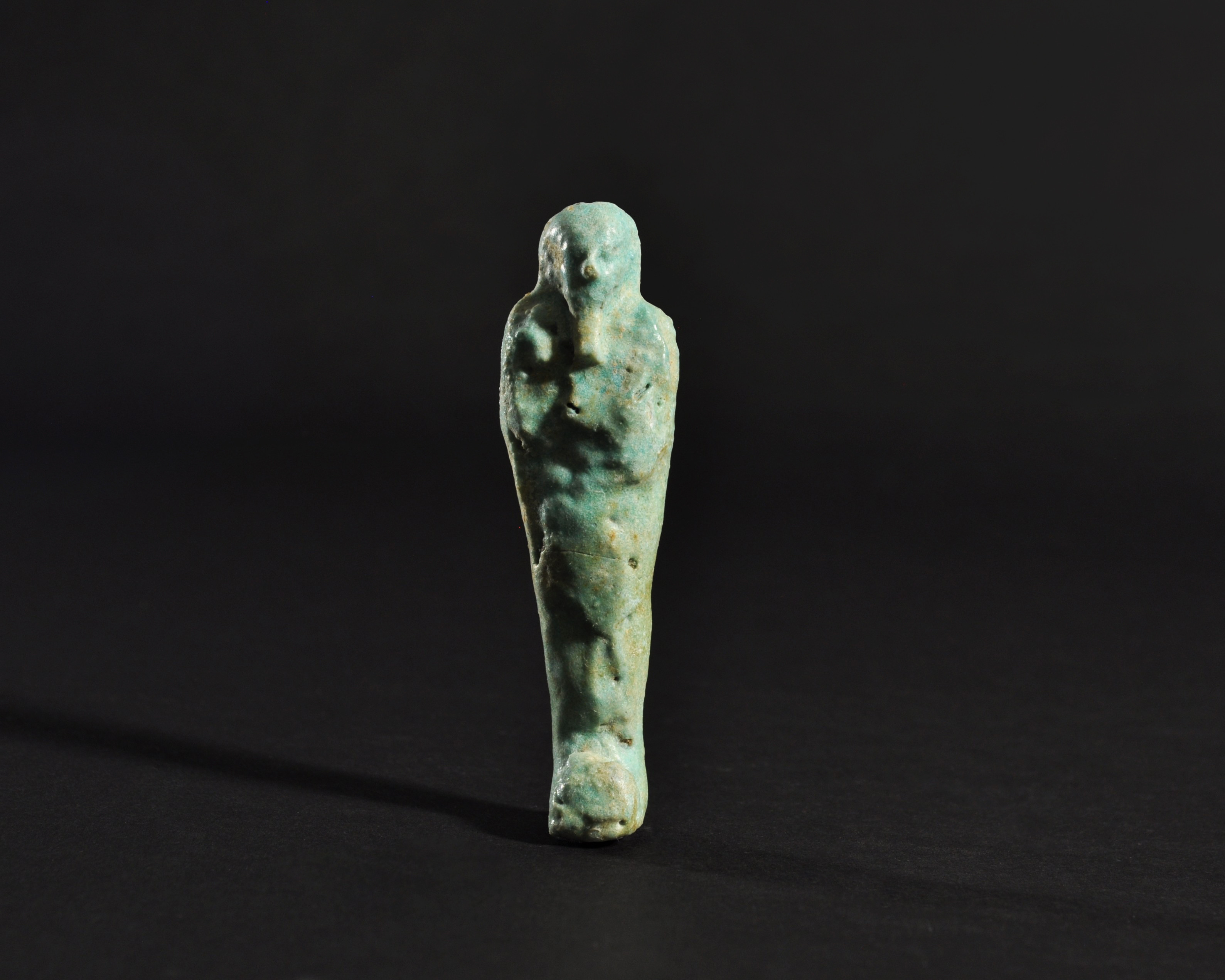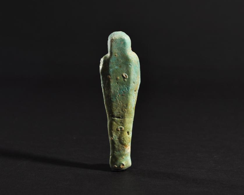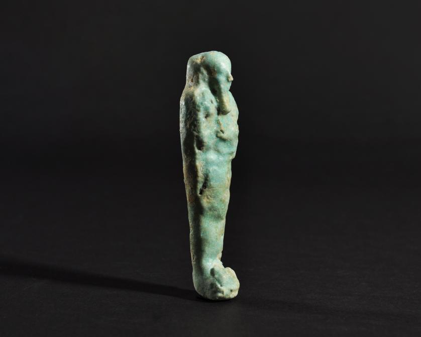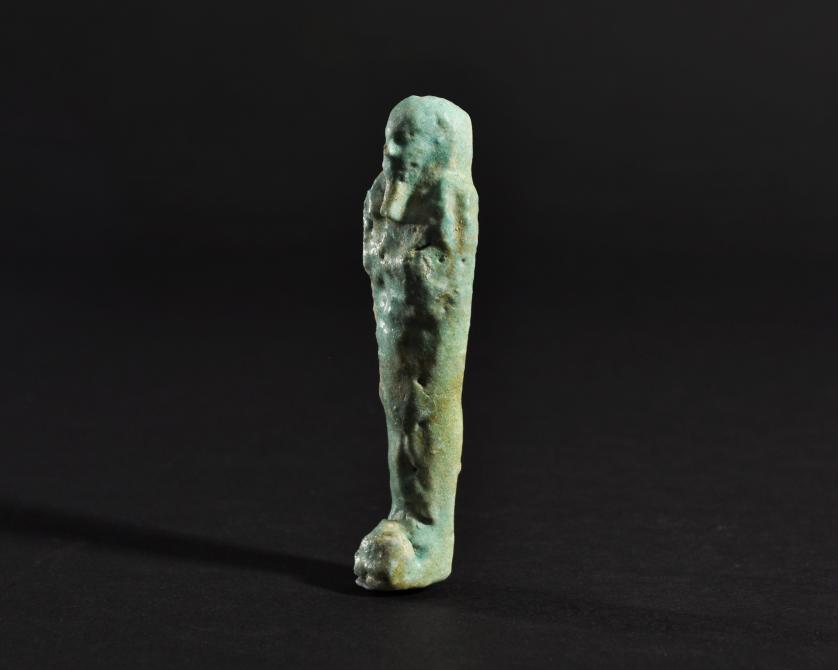 ARQUEOLOGÍA. EGIPTO. Baja Época. Ushebti con barba postiza (664-332 a.C.). Fayenza. Altura 9 cm. Fragmentado y restaurado.