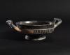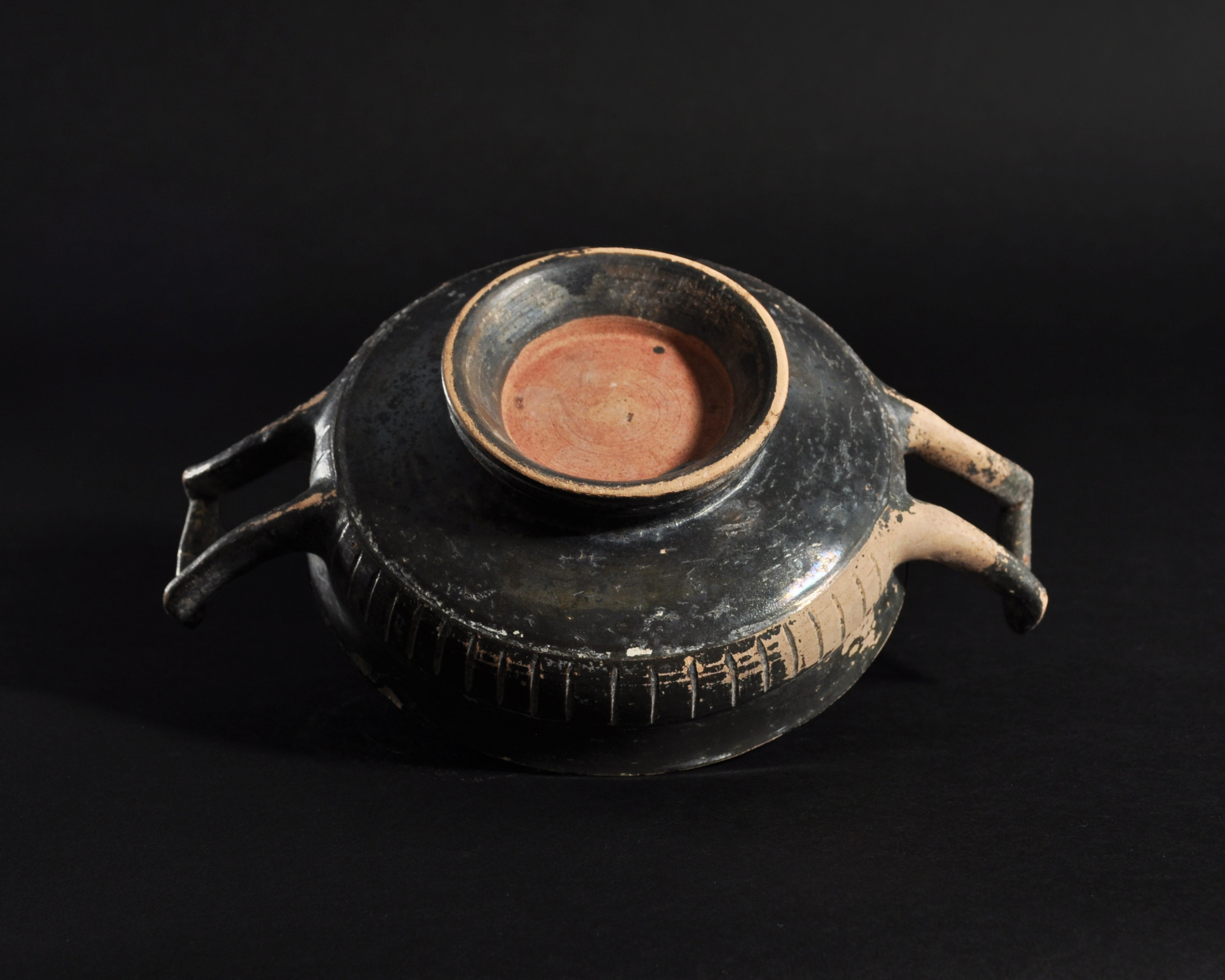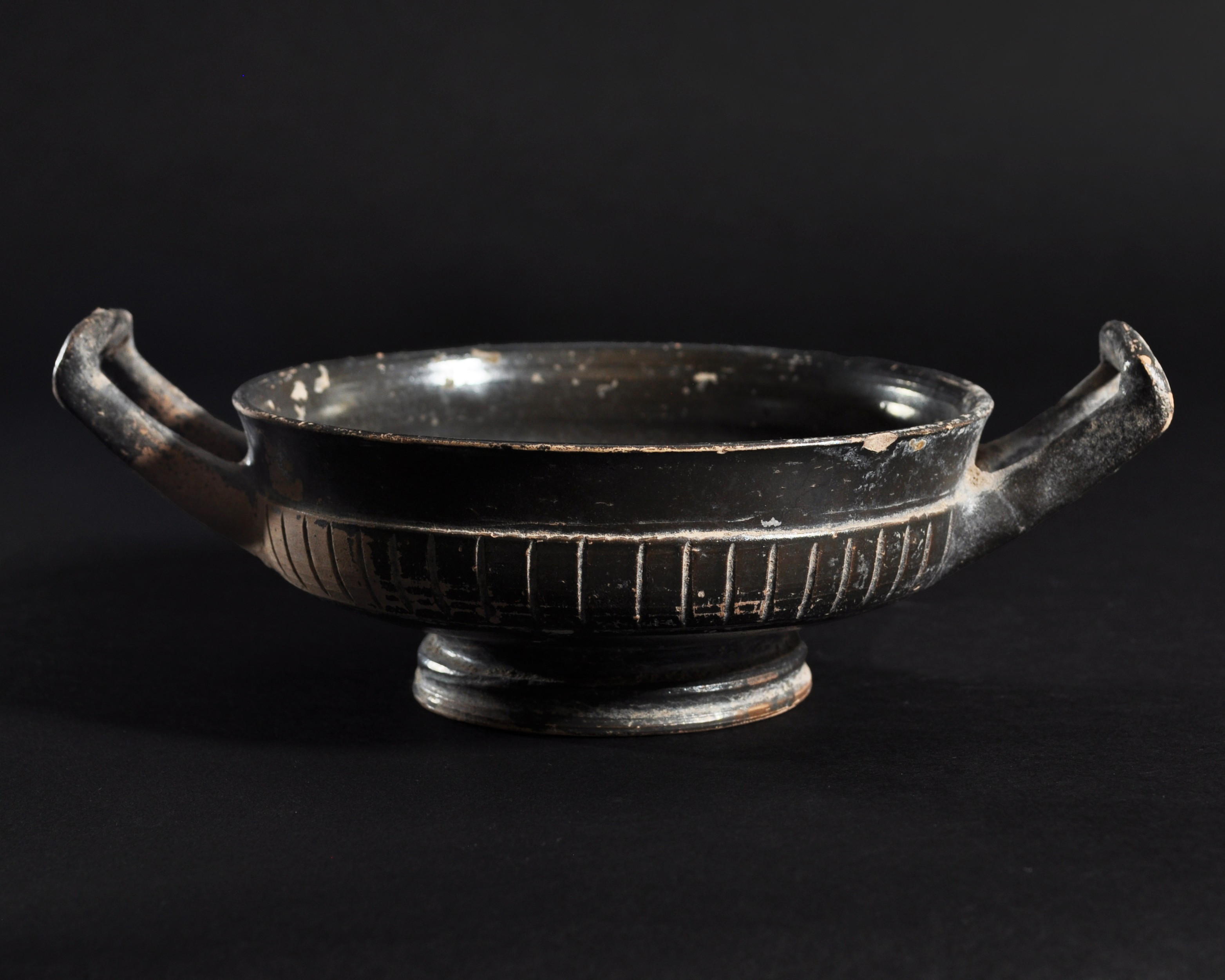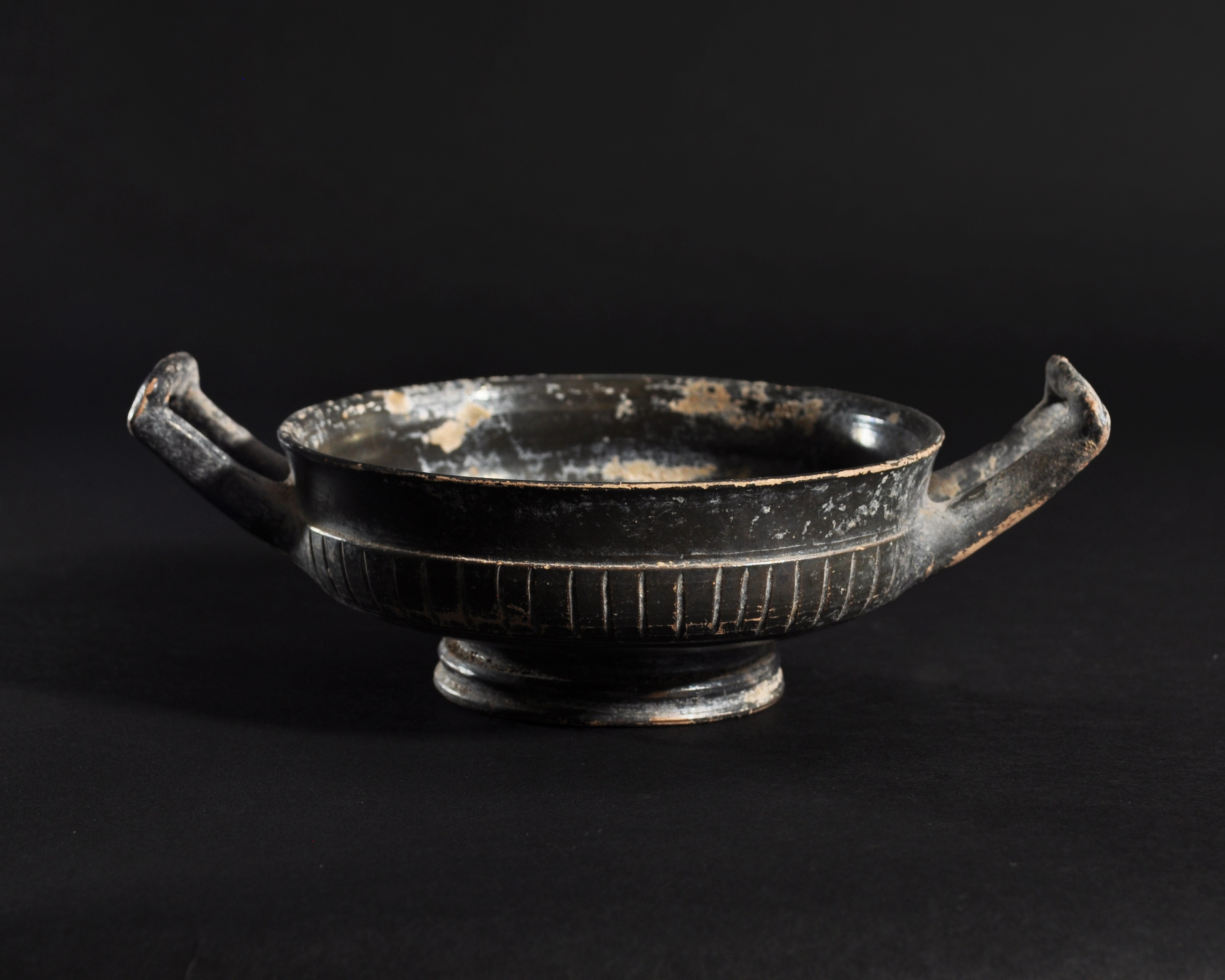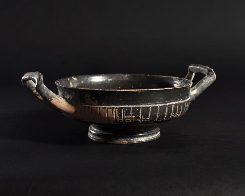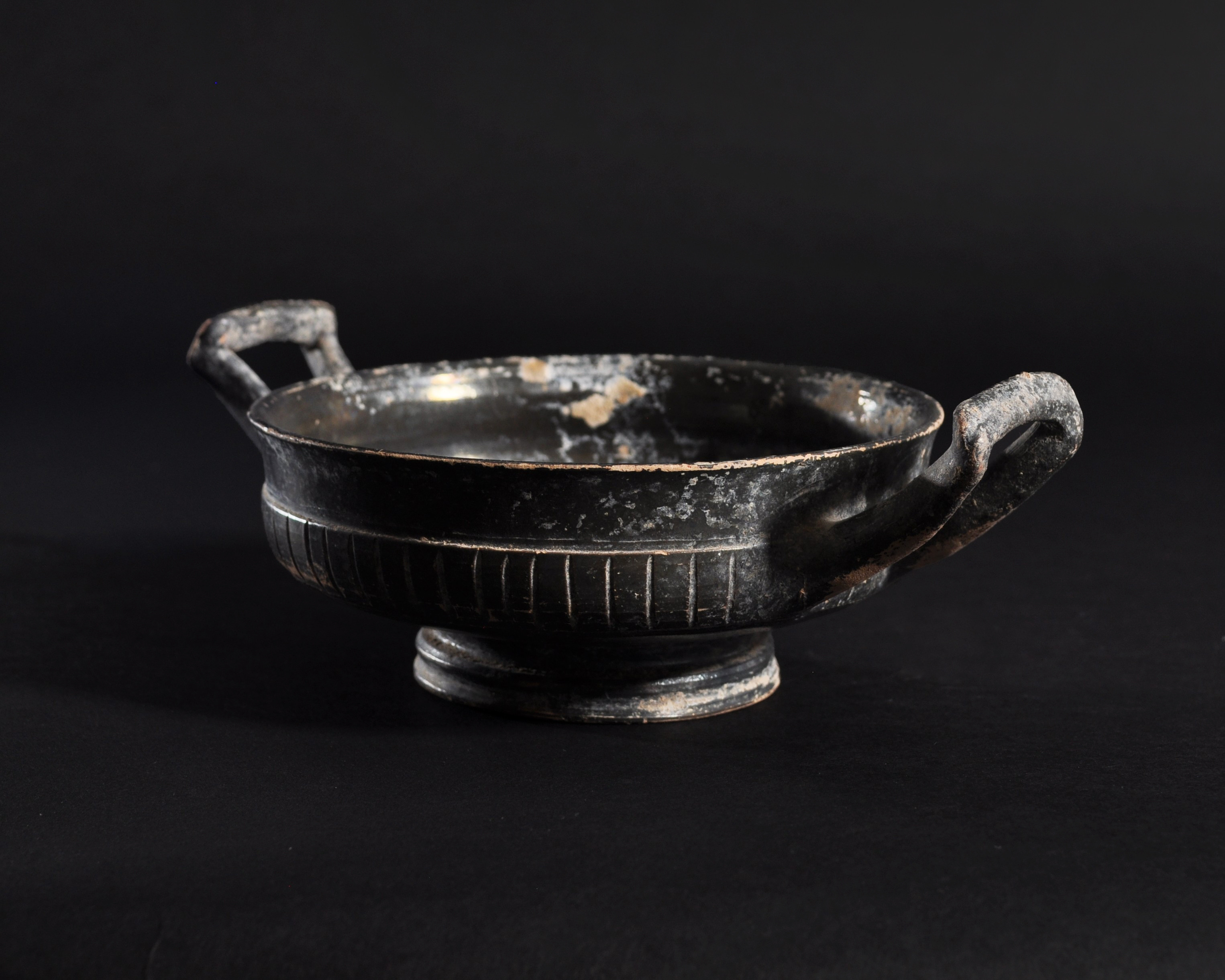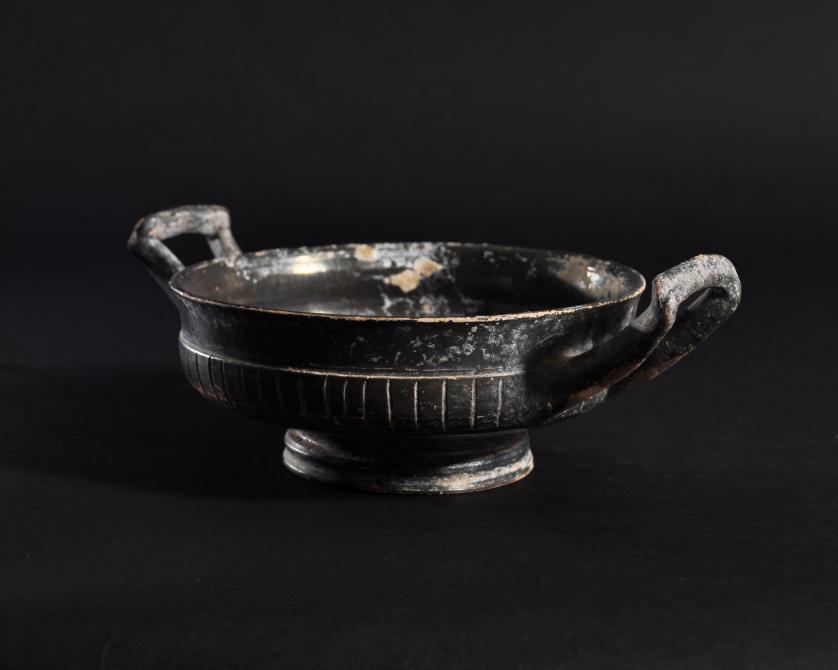 ARQUEOLOGÍA. GRECIA ANTIGUA. Apulia. Kylix con cuerpo con decoración incisa acanalada (siglo IV a.C.). Cerámica de barniz negro. Altura 6,5 cm. Longitud 19 cm.