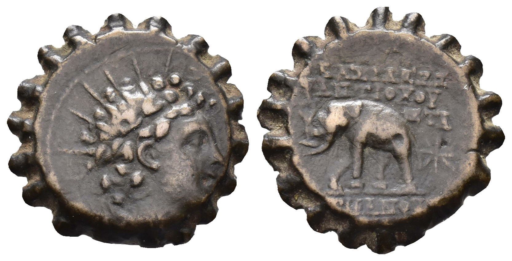 GRECIA ANTIGUA. REYES SELÉUCIDAS. Antíoco VI (145-141 a.C.). Antioquía del Orontes. AE. A/ Cabeza radiada a der. R/ Elefante a izq. con antorcha en la trompa, detrás estrella. AE 7,89 g. 21,2 mm. COP-304. Anv. algo descentrado. MBC/MBC-..