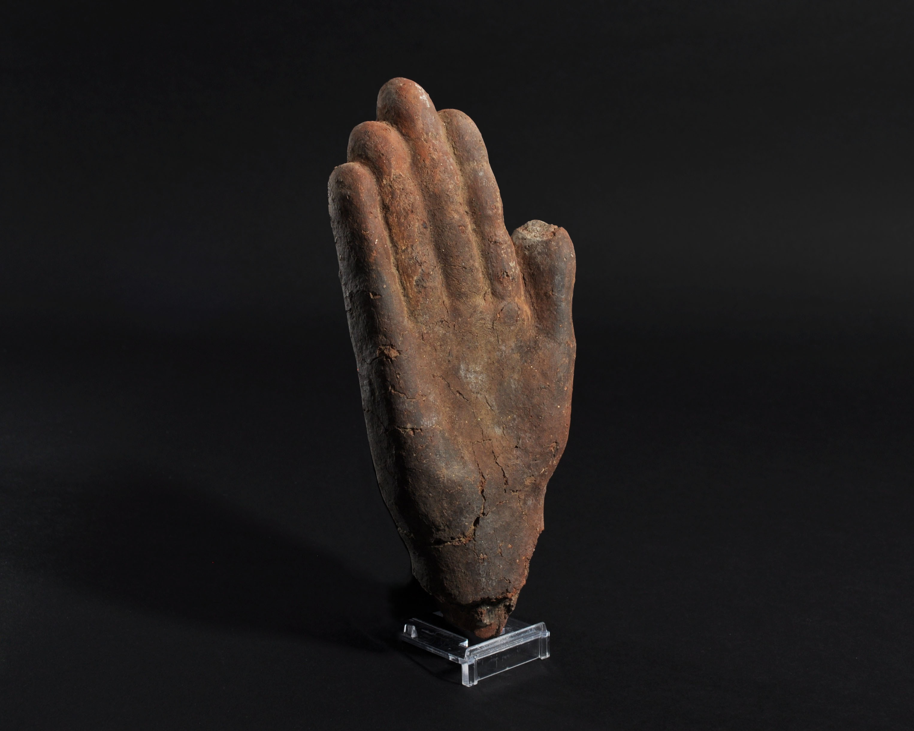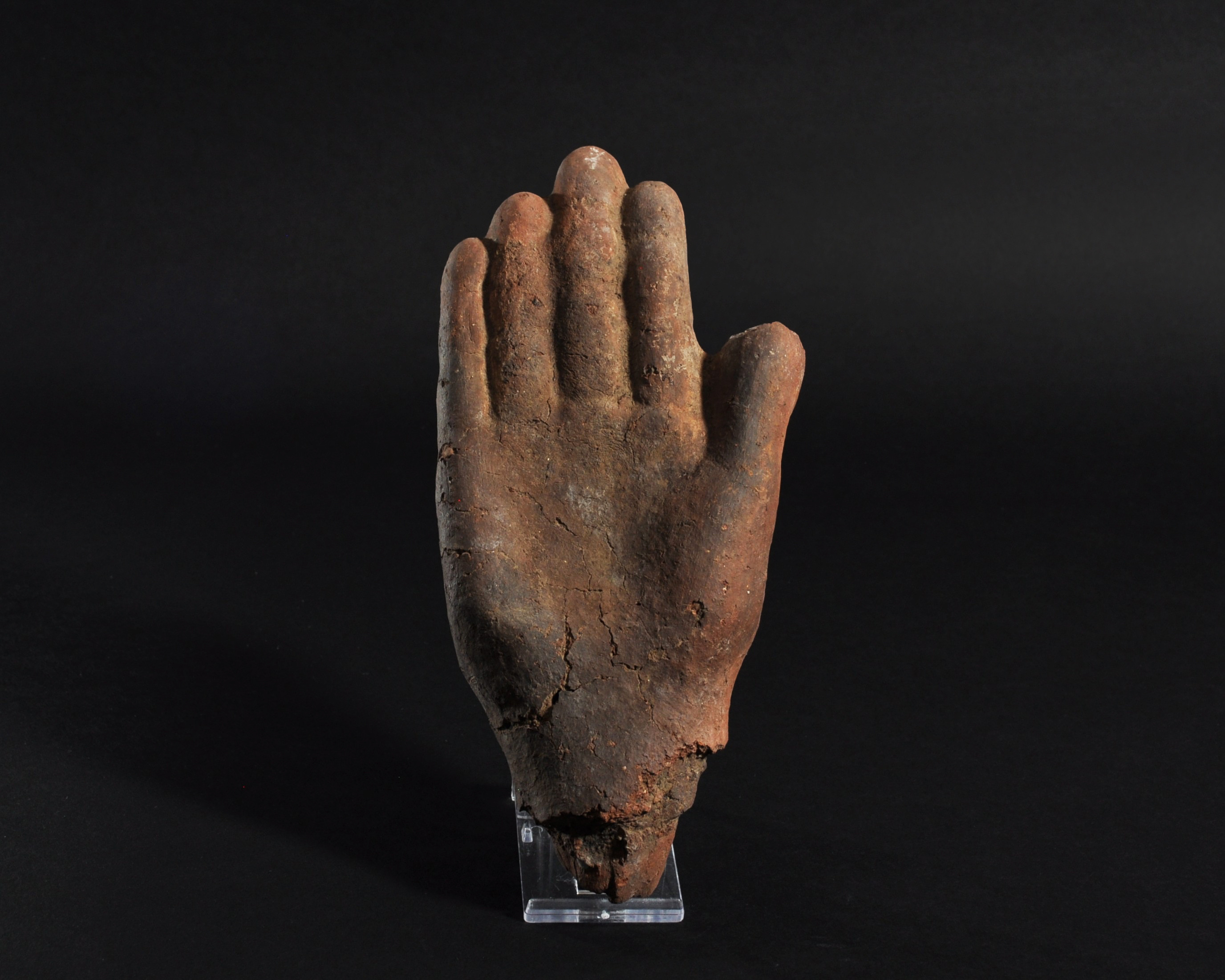 ARQUEOLOGÍA. ETRUSCOS-ROMA. Exvoto en forma de mano (ss. III-I a.C.). Terracota. Longitud 20 cm.