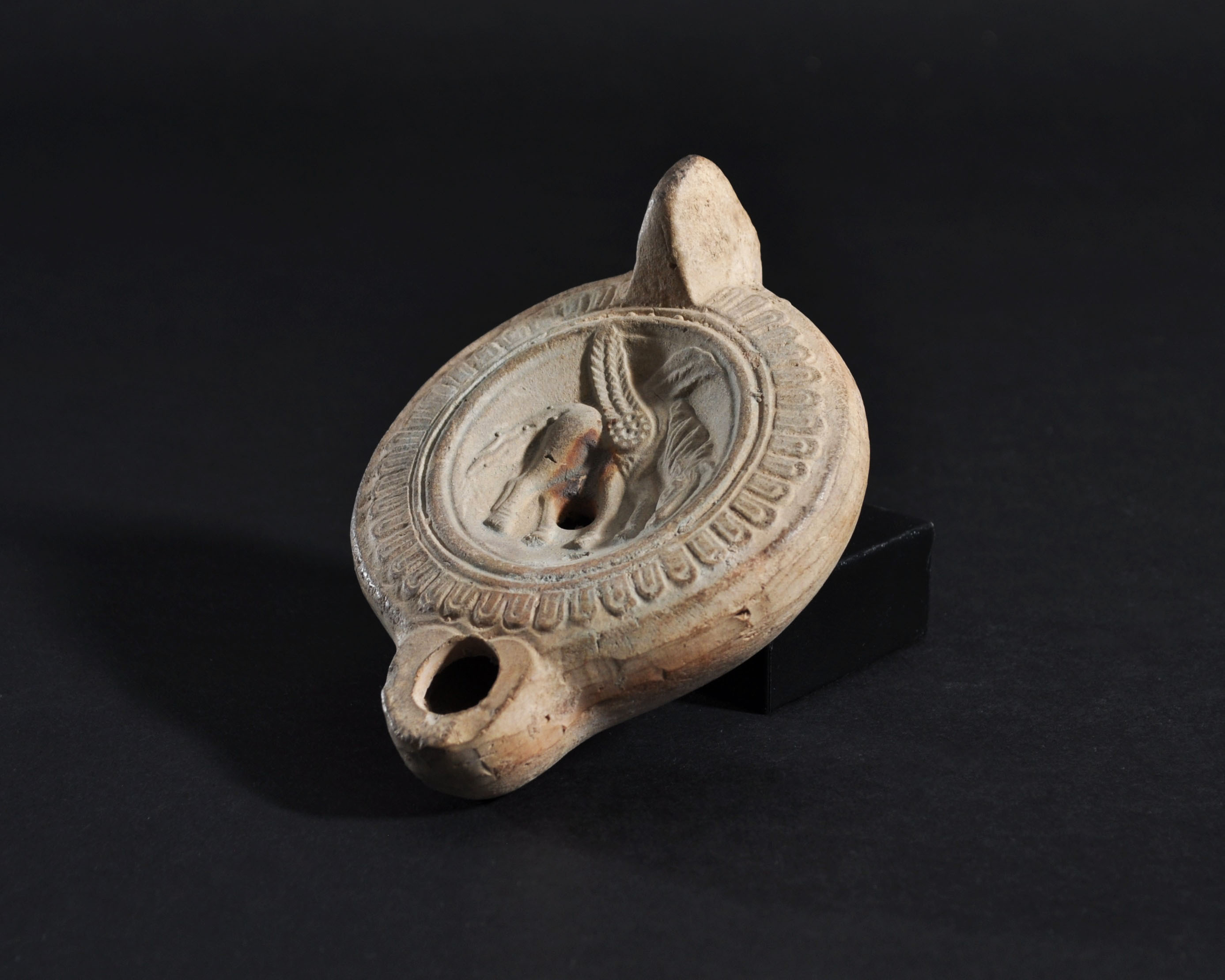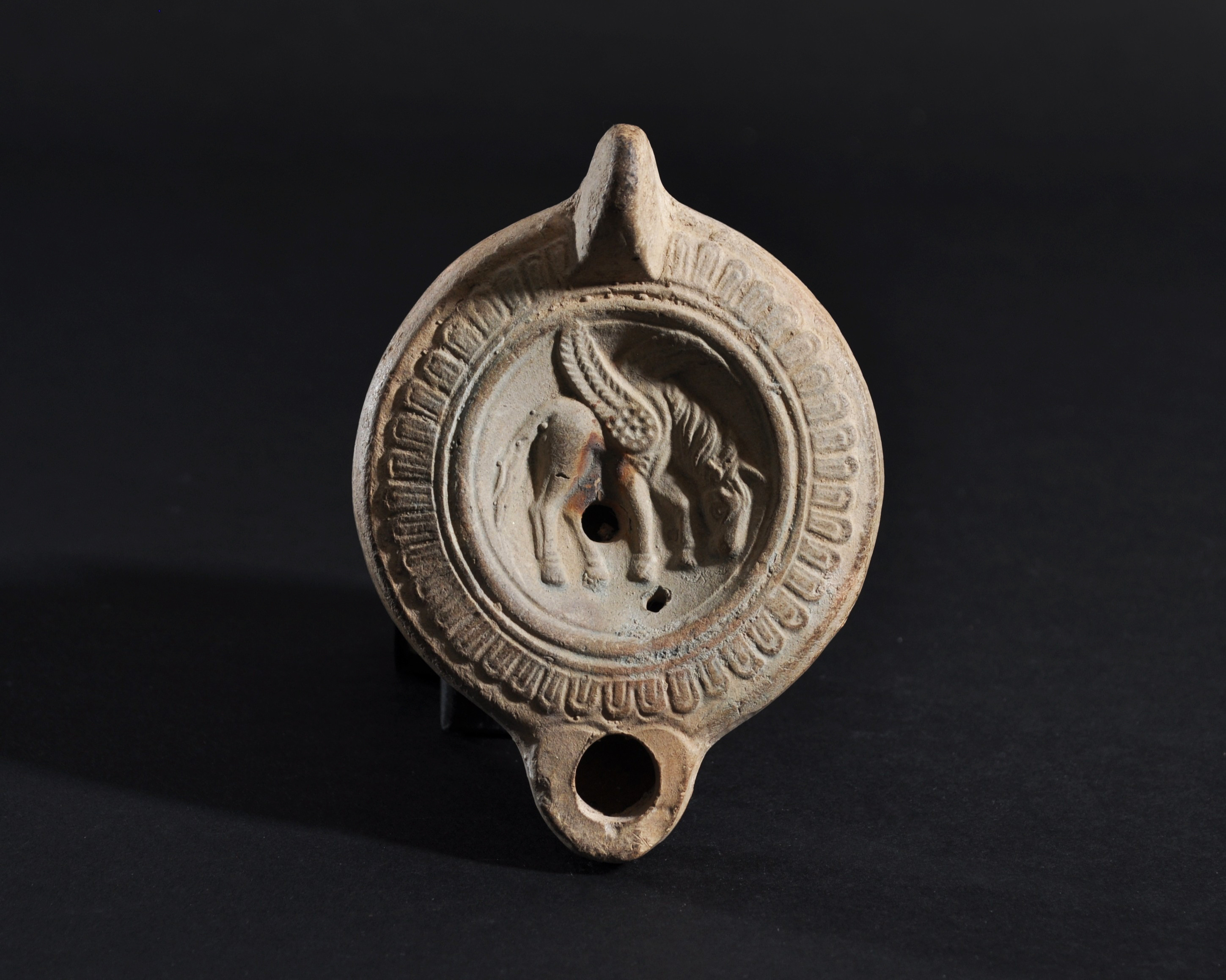 ARQUEOLOGÍA. ROMA. Lucerna con decoración de pegaso (ss. II-III d.C). Terracota. Longitud 11,4 cm. Adjunta certificado de termoluminiscencia QED Laboratoire.