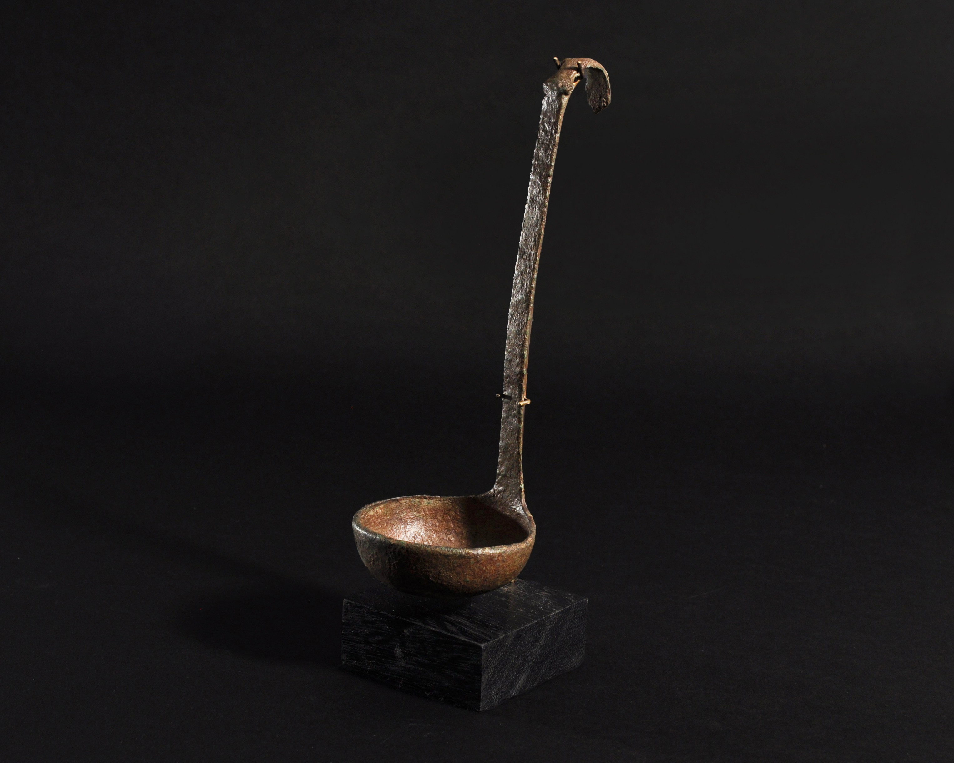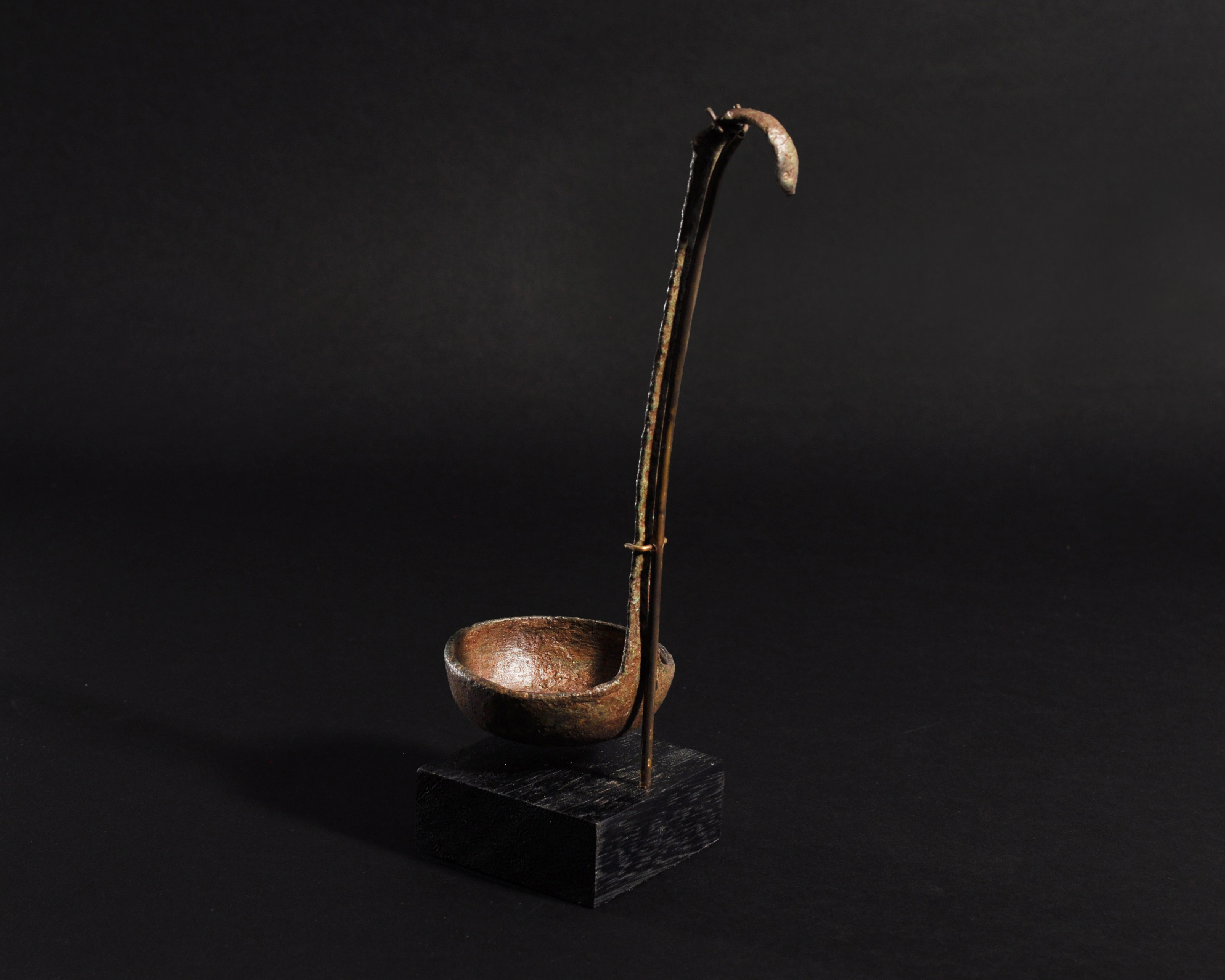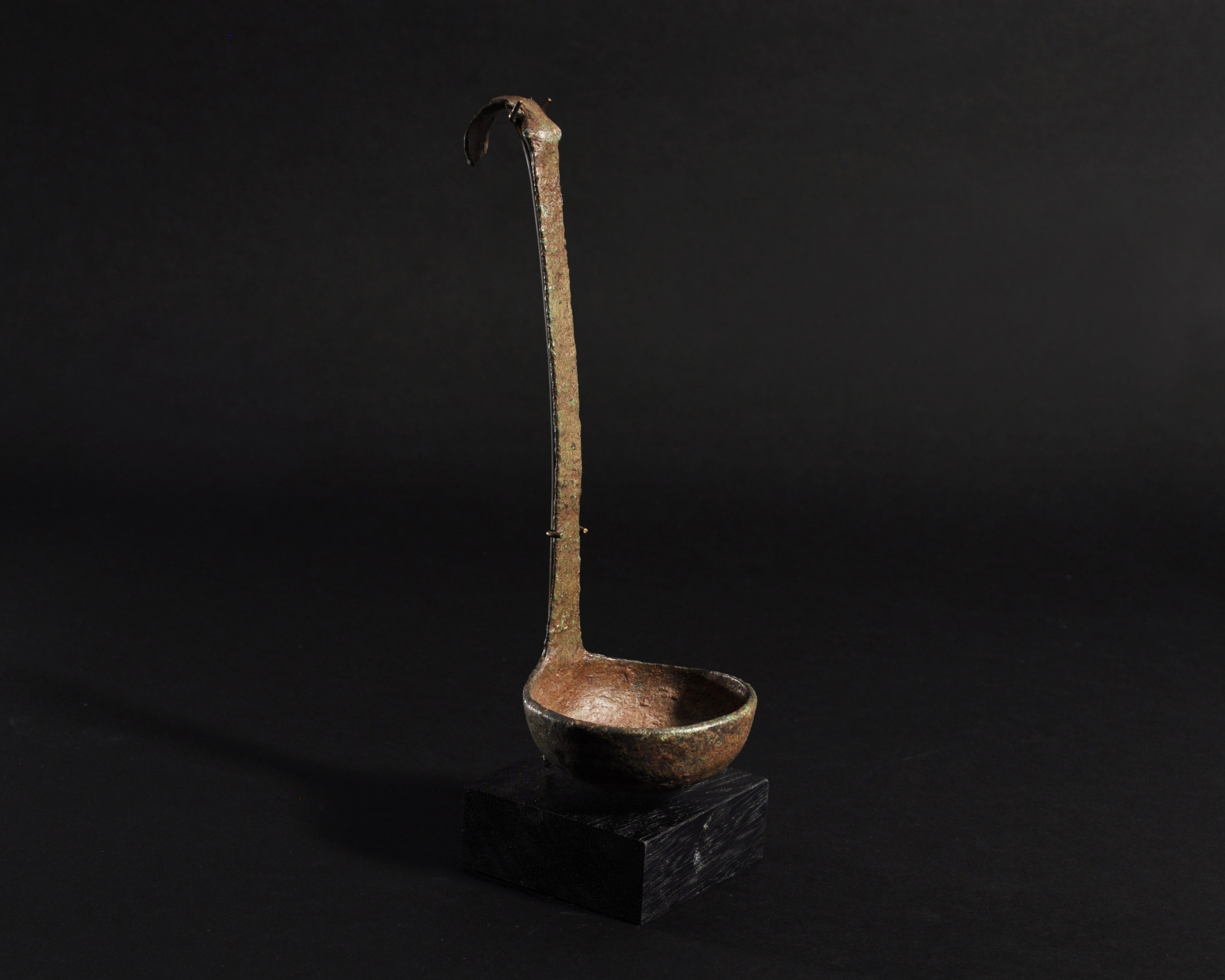 ARQUEOLOGÍA. ROMA. Símpulo de mango vertical plano con remate zoomorfo (ss. II-I a.C.). Bronce. Altura 18 cm. Incluye peana.