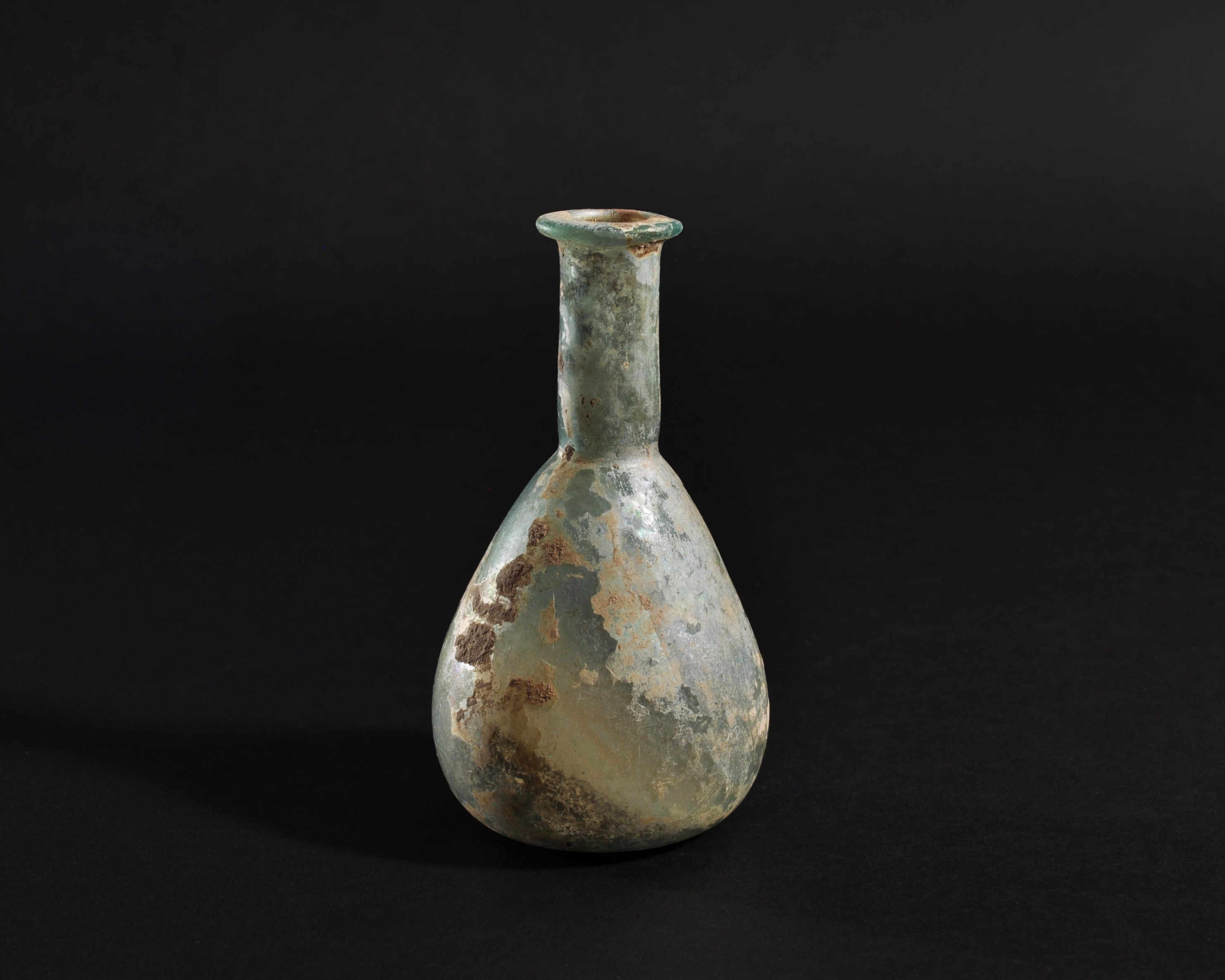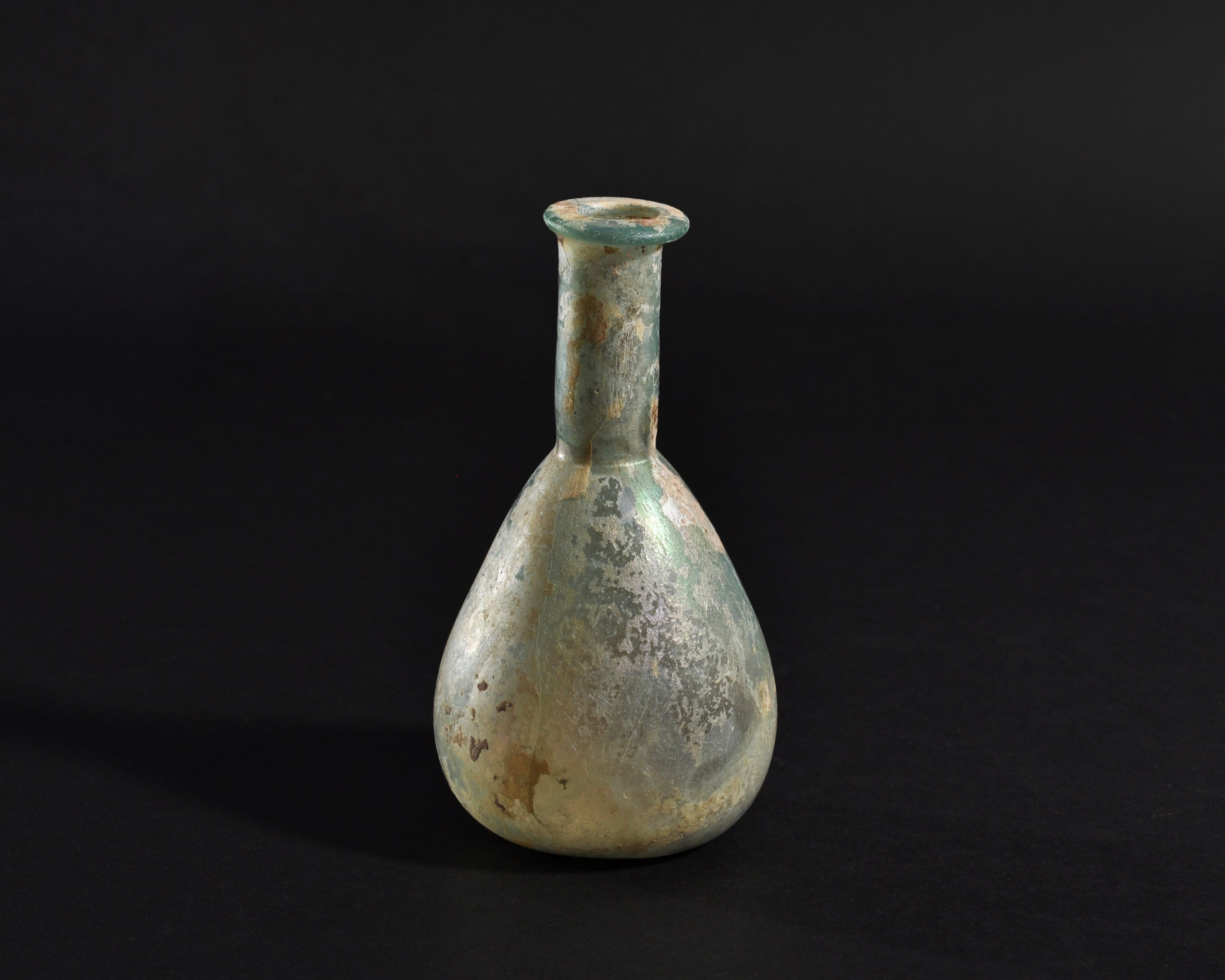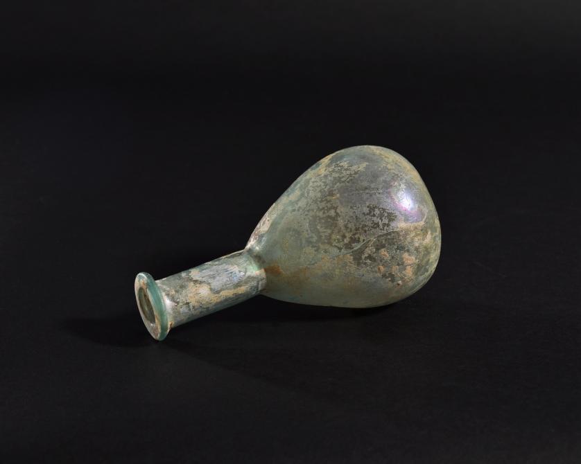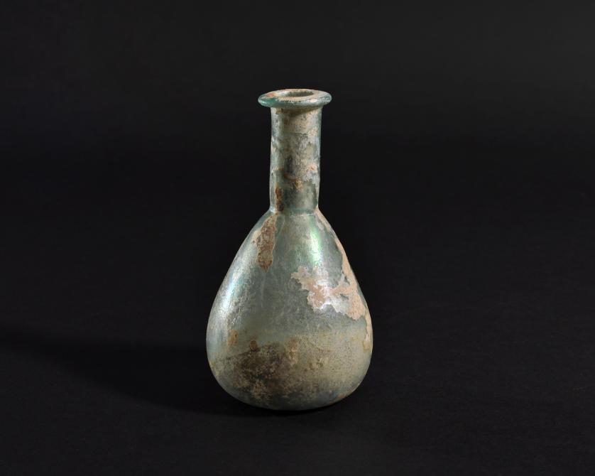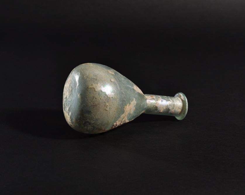 ARQUEOLOGÍA. ROMA. Ungüentario de cuerpo piriforme y boca exvasada (ss. I-IV d.C.). Vidrio con irisaciones. Altura 12,1 cm. Solo envío a España.