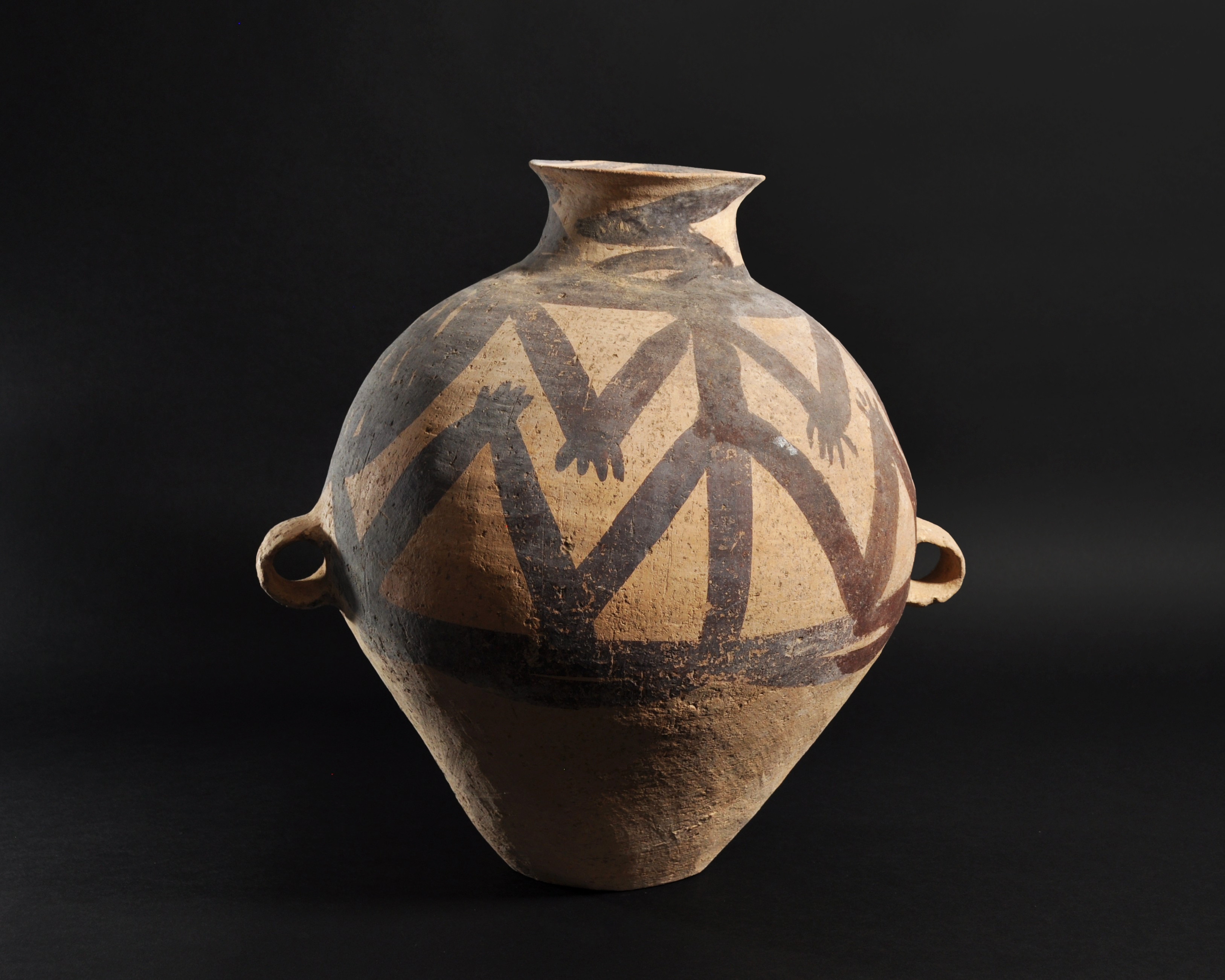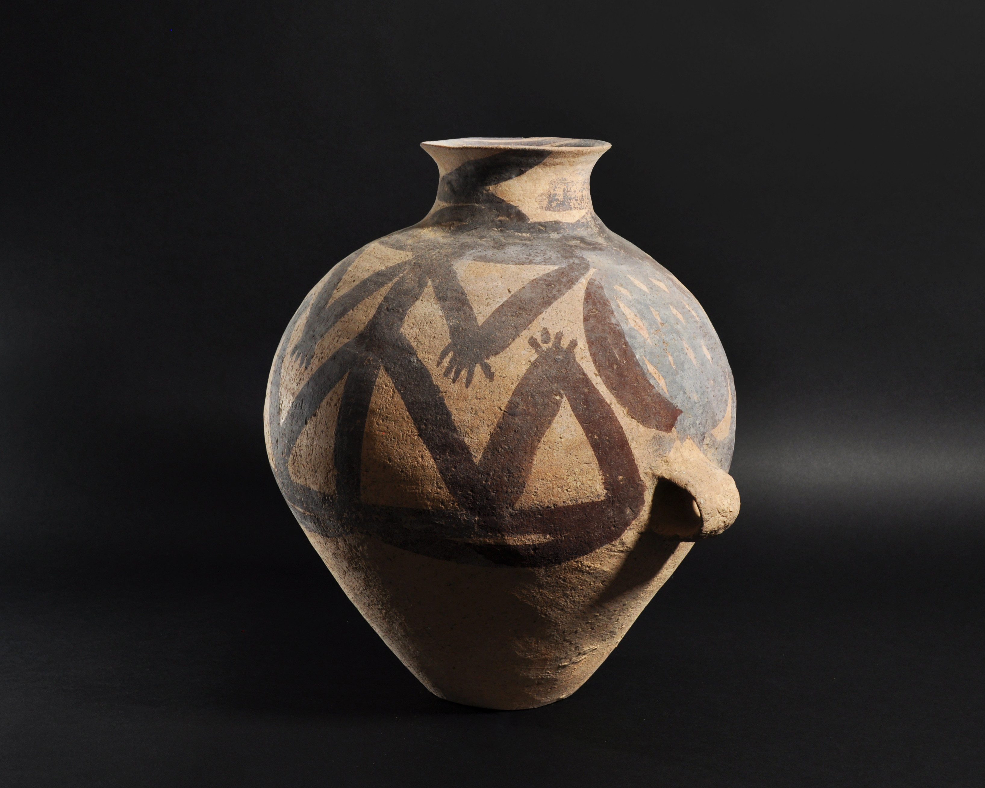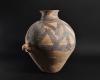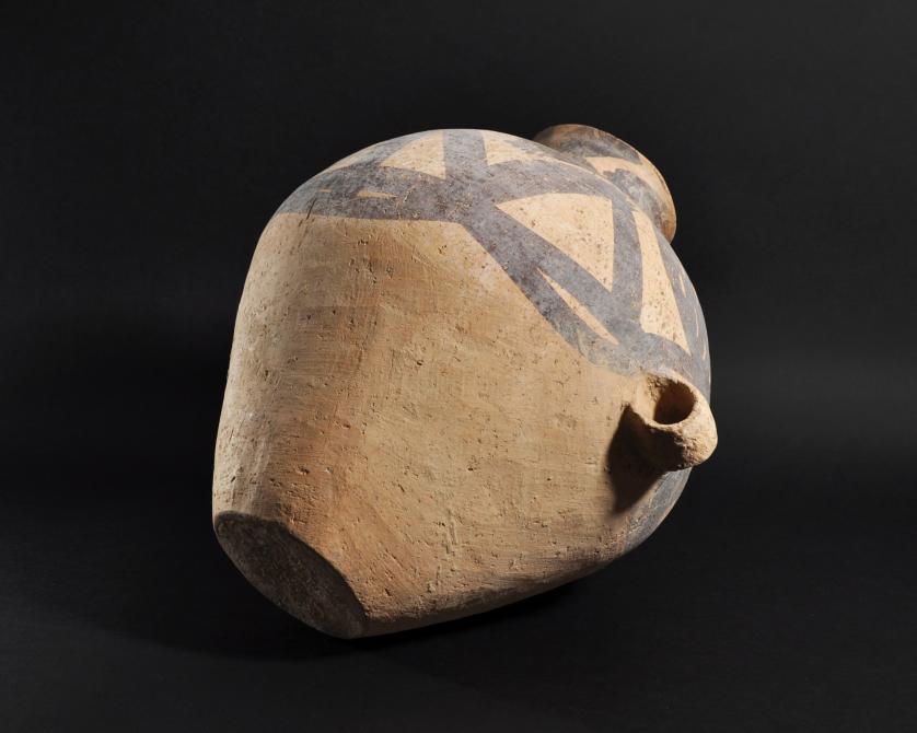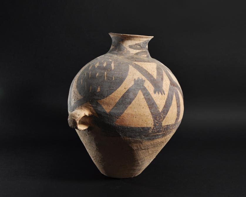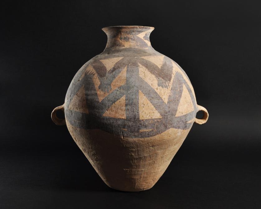 ARQUEOLOGÍA. CHINA. Neolítico. Cultura Majiayao. Vasija con dos asas y decoración geométrica pintada (ca. 2500 a.C.). Cerámica. Altura 38 cm. Adjunta certificado de termoluminiscencia QED Laboratoire. Adjunta declaración de importación del Ministerio de Cultura de España (no sujeto a tasas de exportación).