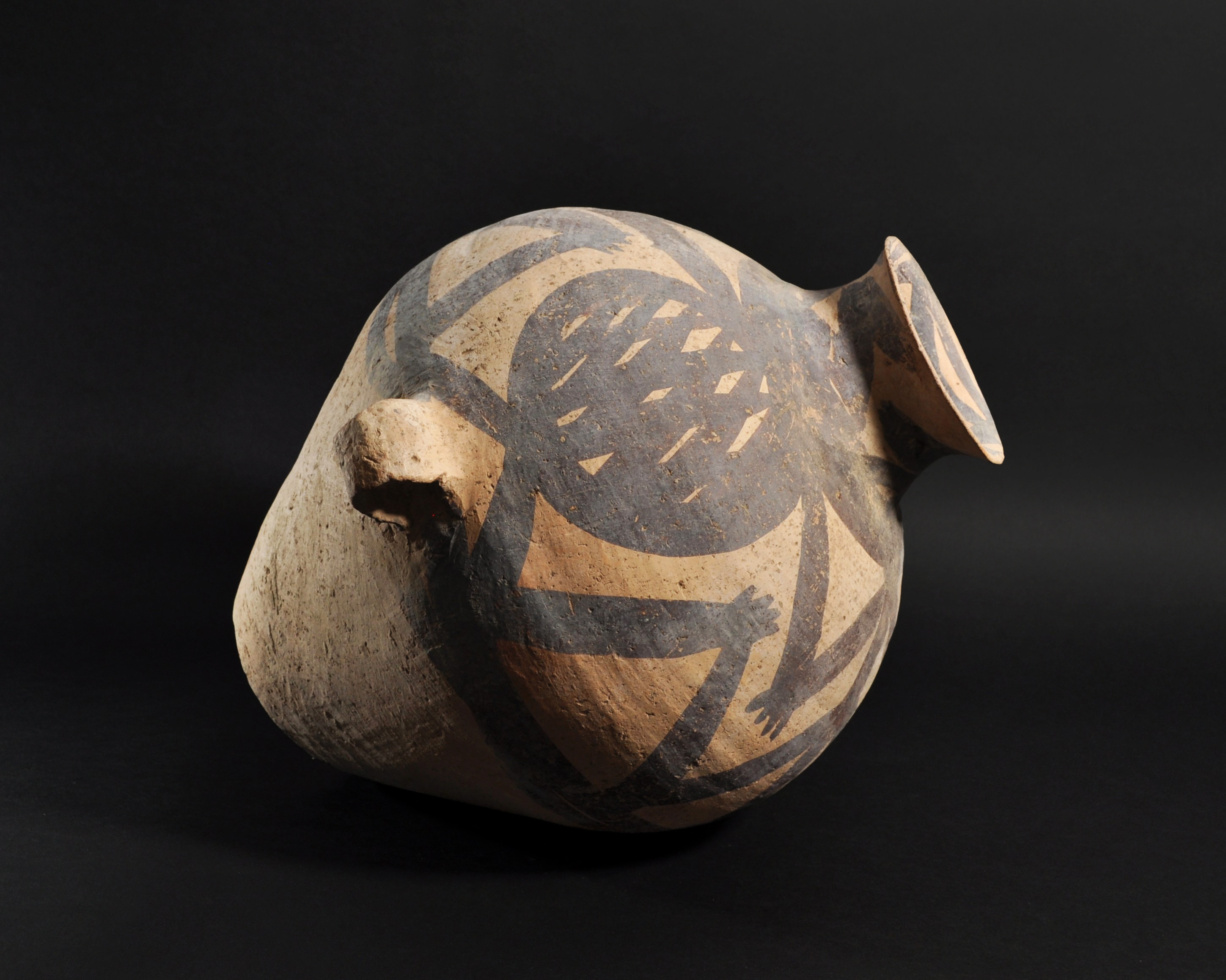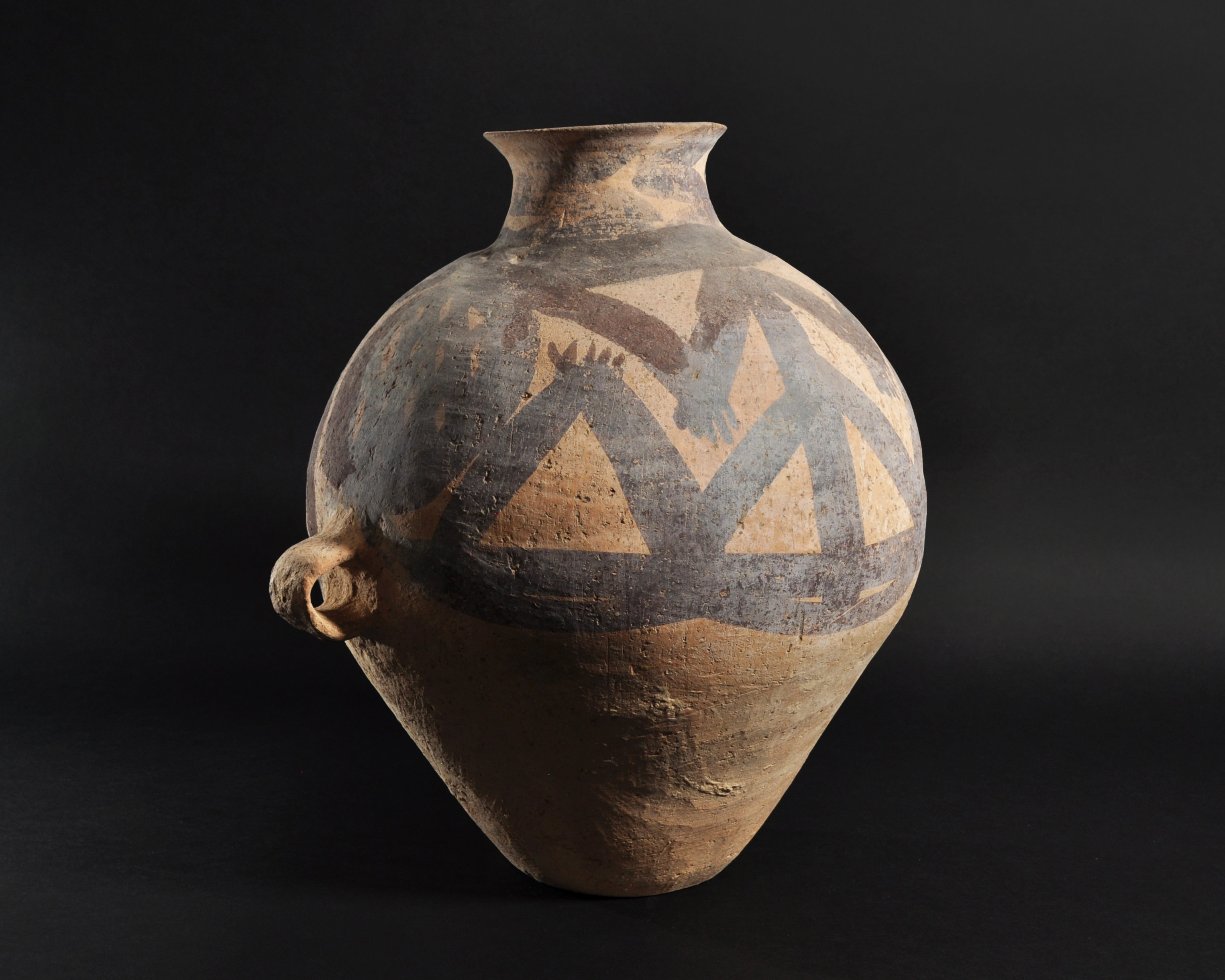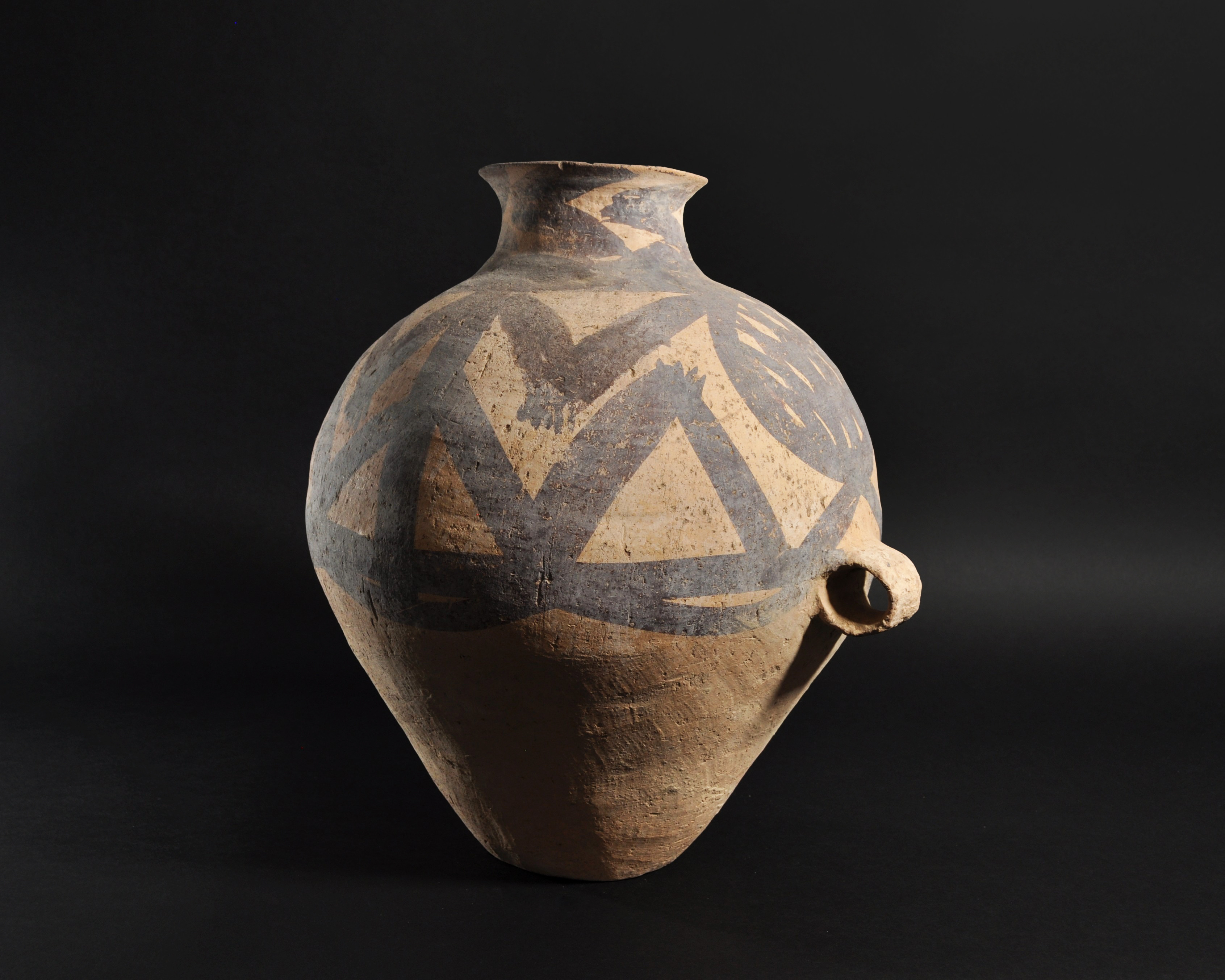 ARQUEOLOGÍA. CHINA. Neolítico. Cultura Majiayao. Vasija con dos asas y decoración geométrica pintada (ca. 2500 a.C.). Cerámica. Altura 38 cm. Adjunta certificado de termoluminiscencia QED Laboratoire. Adjunta declaración de importación del Ministerio de Cultura de España (no sujeto a tasas de exportación).