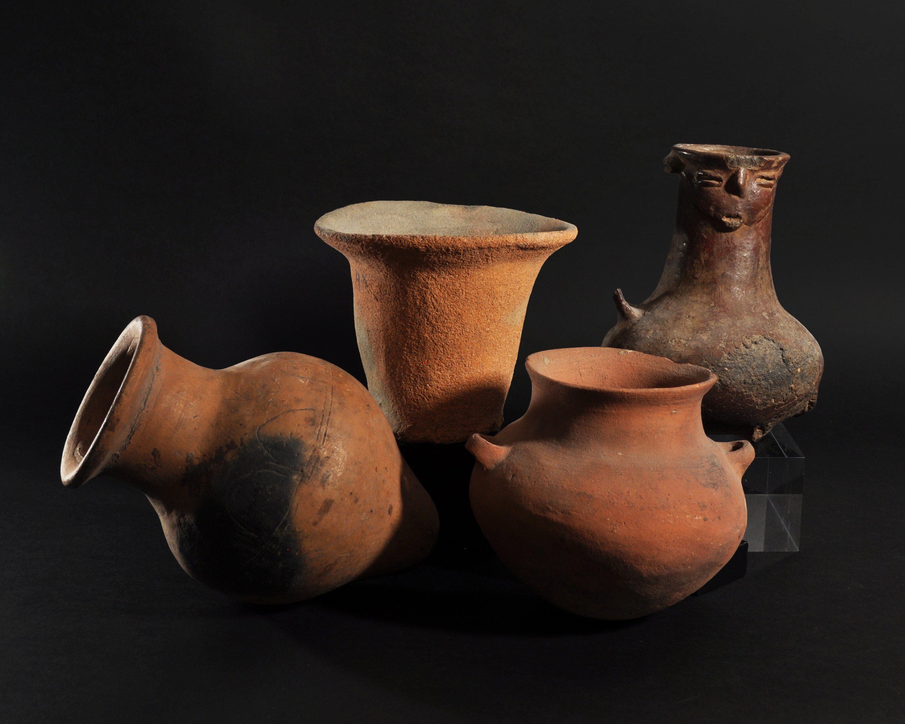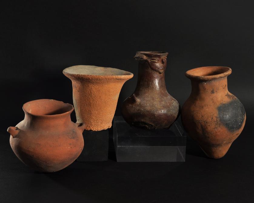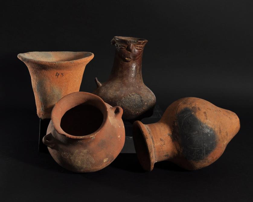 ARQUEOLOGÍA. PREHISPÁNICO. Ecuador. Lote de 4 vasos. Diferentes épocas y culturas. Cerámica. Longitud de 12,5 a 20 cm. Una de ellas presenta faltas.