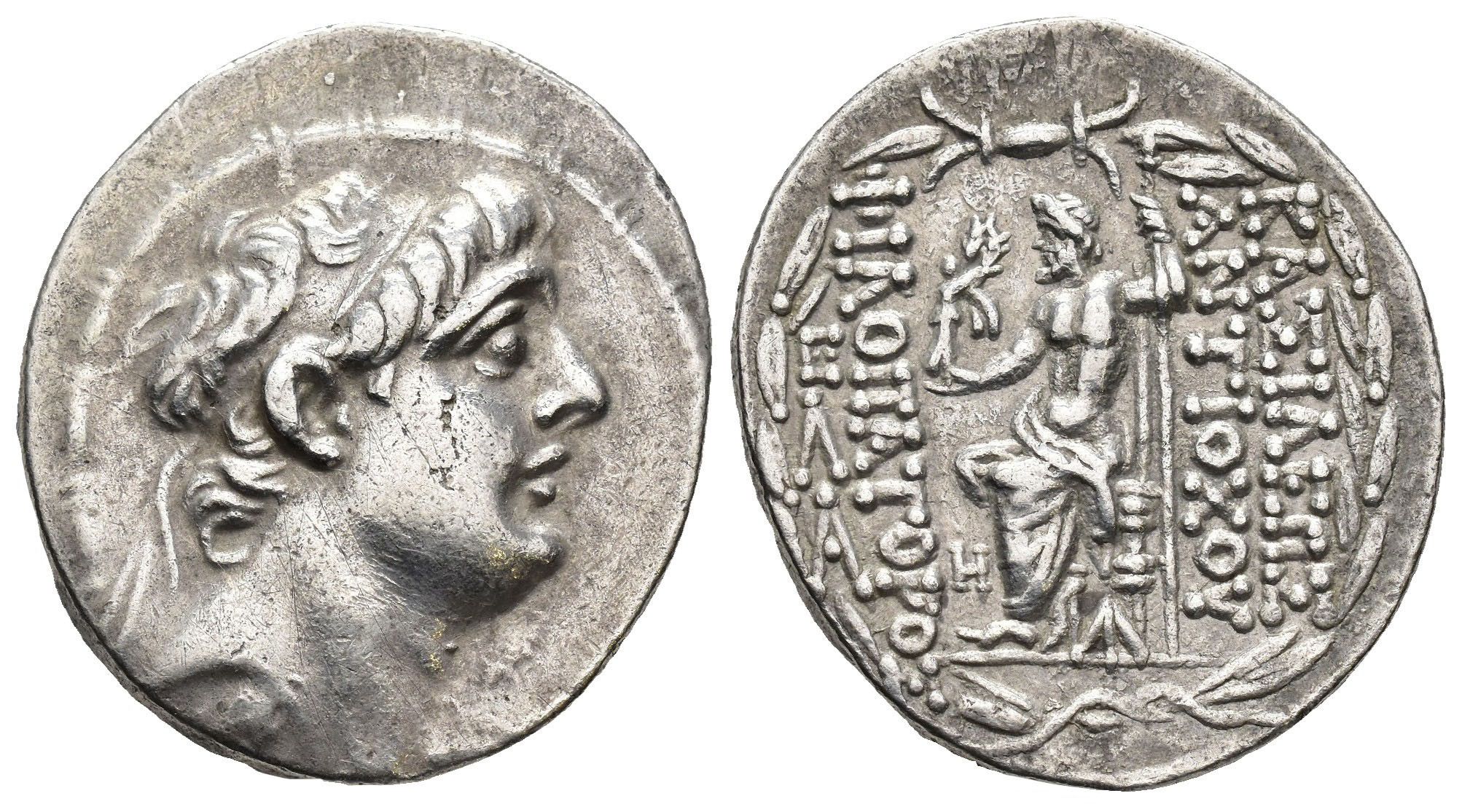 GRECIA ANTIGUA. REYES SELÉUCIDAS. Antíoco IX (116-95 a.C.). Tetradracma. A/ Cabeza diademada a der. R/ Zeus entronizado a izq. Con Niké y cetro, delante H, debajo monograma, delante 2 monogramas, todo dentro de láurea. AR 16,05 g. 29,4 mm. COP-410 var. MBC/MBC+.
