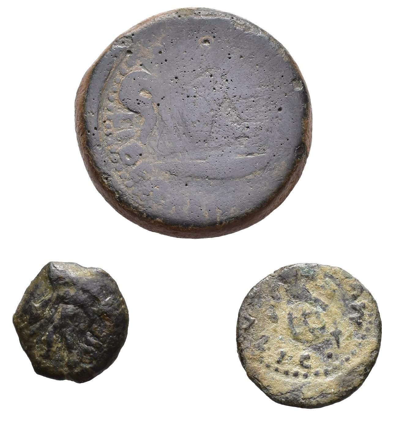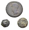 HISPANIA ANTIGUA. Lote de 3 piezas de la Ulterior: 1 dupondio de Ebora de Augusto, 1 cuadrante de Italica de Tiberio y 1 cuadrante de Osset. RC/BC-.