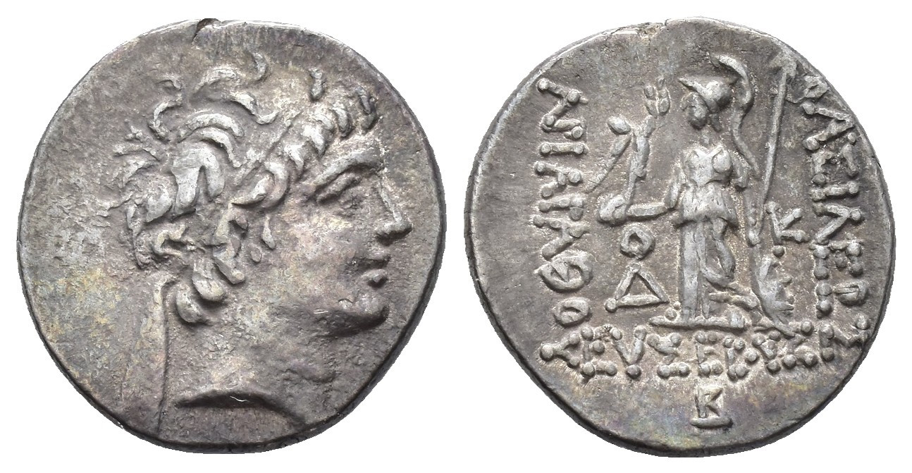 GRECIA ANTIGUA. CAPADOCIA. Ariarates V (161 a.C.). Dracma.A/ Cabeza diademada a der. R/ Atenea a izq. con Nike y lanza, delante y detrás monogramas, en exergo B (año 2). AR 4,16 g. 17,3 mm. COP-137 var. MBC+/MBC.