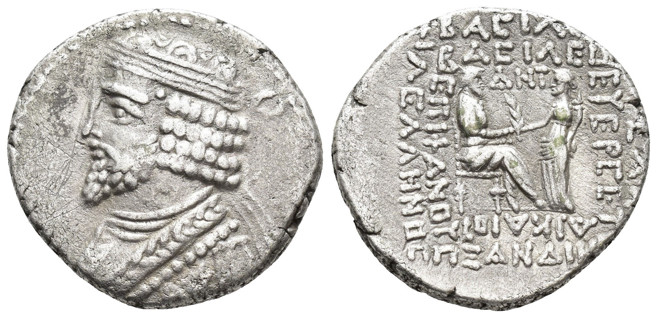 GRECIA ANTIGUA. PARTIA. Vardanes I (40-46 d.C.). Tetradracma. A/ Busto diademado a izq. R/ El rey entronizado a der. recibiendo palma de Tyche con cornucopia frente a él, fecha DNT. AR 14,45 g. 26,8 mm. SPP-64.6 var. fecha. Leves erosiones y fina raya. MBC.