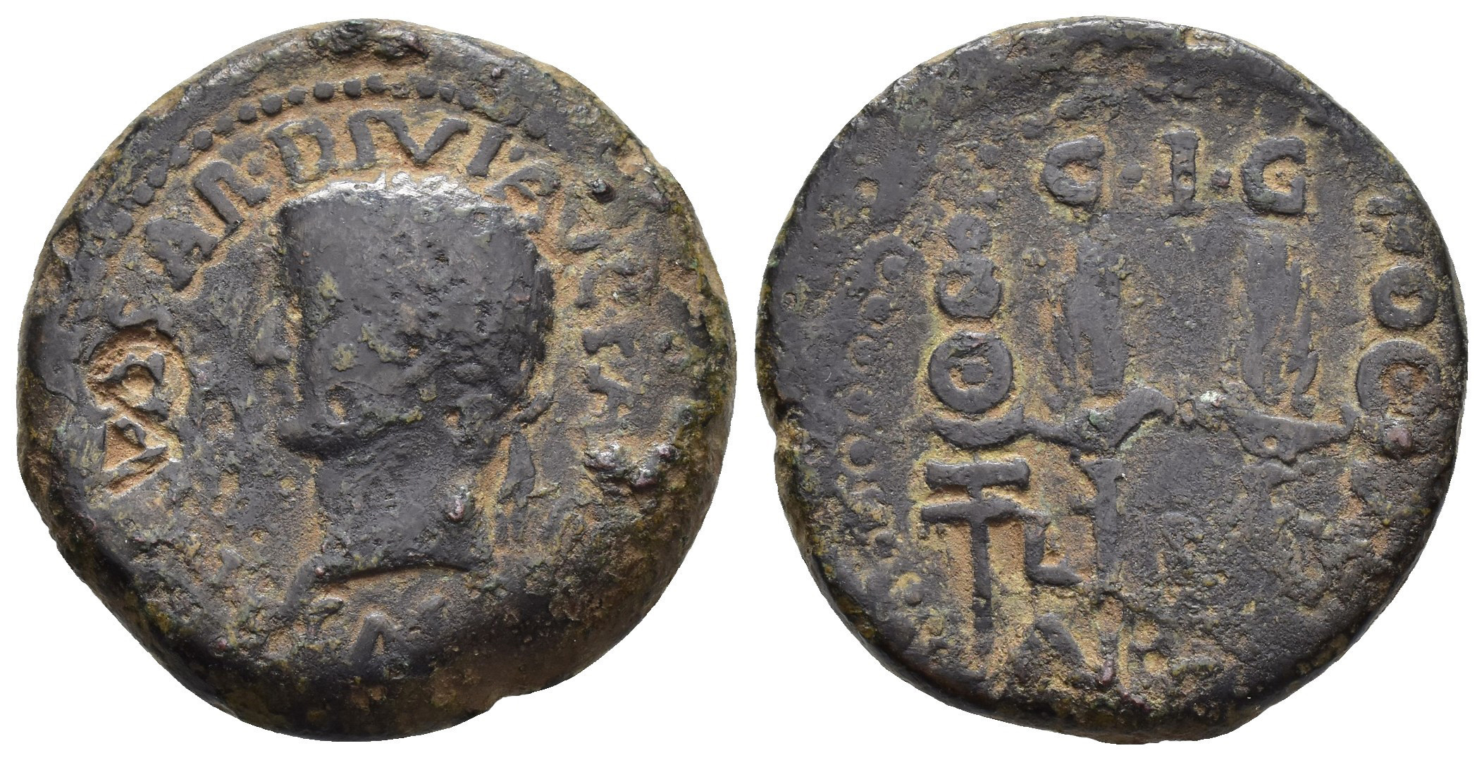HISPANIA ANTIGUA. ACCI. Tiberio. As. A/ Cabeza laureada a izq.; (TI) CAESAR DIVI AVG F A(VGVSTVS). R/ Dos aquilae entre dos signa, en medio L-(I-II); C I G/ A(CCI). Contramarca CA en anv. AE 17,26 g. 29 mm. I-39; APRH-139; ACIP-3007; CC-4348, mismo ejemplar. Pátina oscura con erosiones. BC+.
