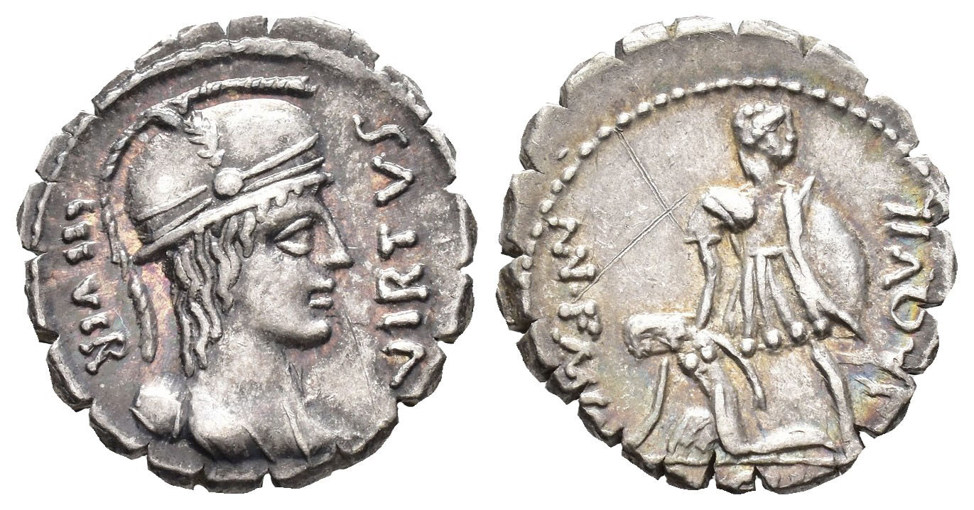 REPÚBLICA ROMANA. AQUILIA. Mn. Aquilius. Denario serrato. Roma (71 a.C.). A/ Busto de Virtus con casco a der., delante VIRTVS, detrás III VIR. R/ Manlio Aquilio ayudando a Sicilia; ley. MN. AQUIL MN. F. MNN; debajo SICIL. AR 3,85 g. 19,35 mm. CRAW-401.1; FFC-168. Leve grafito en rev. y fina raya en anv. MBC+/EBC-.
