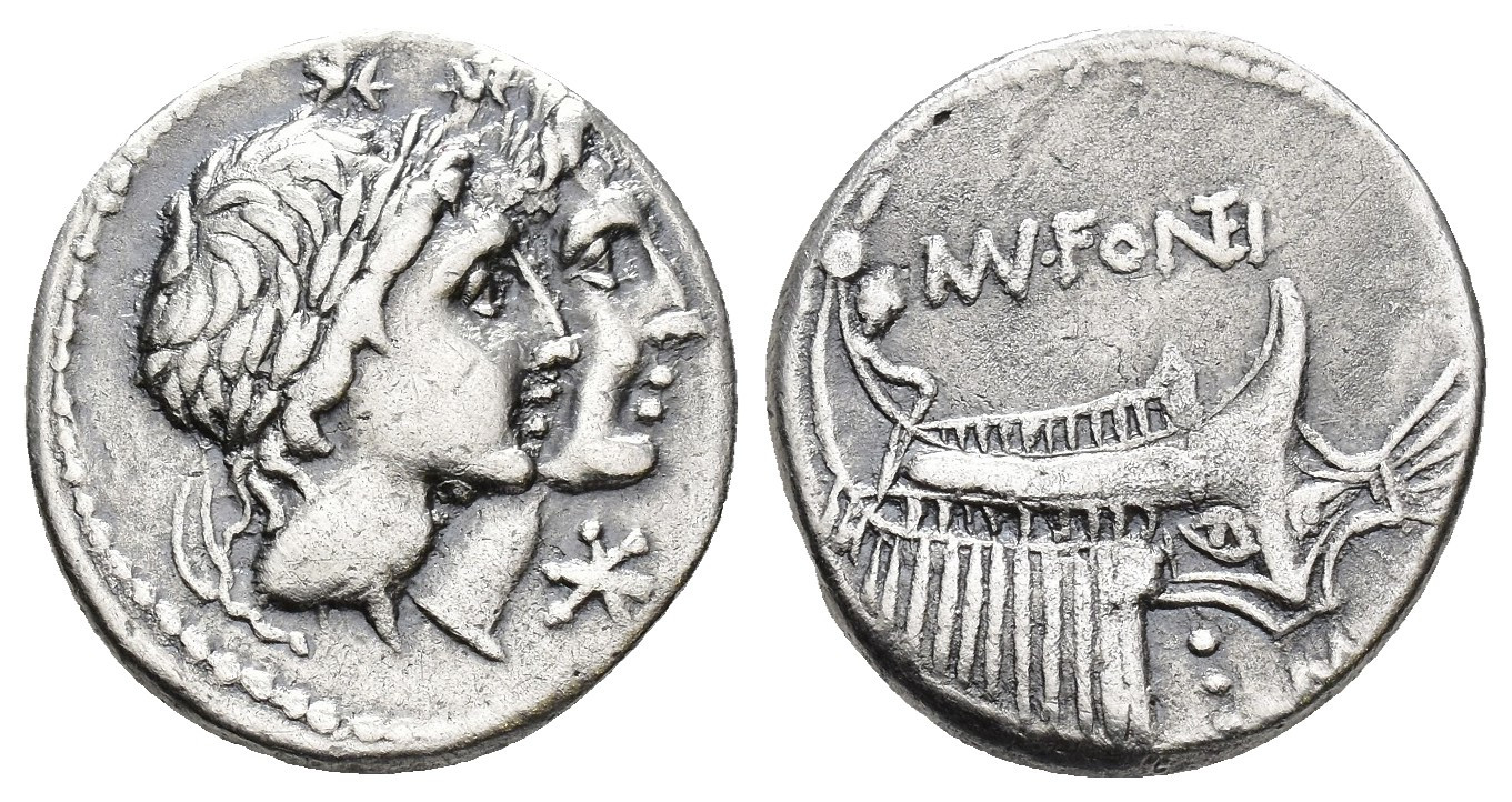 REPÚBLICA ROMANA. FONTEIA. Mn. Fonteius. Denario. Roma (108-107 a.C.). A/ Cabezas laureadas de los Dióscuros a der. R/ Galera con timonel a der., encima MN FONTEI, debajo 3 glóbulos en vertical y M. AR 3,81 g. 19 mm. CRAW-307.1d; FFC-no. Porosidades. MBC. Escasa.