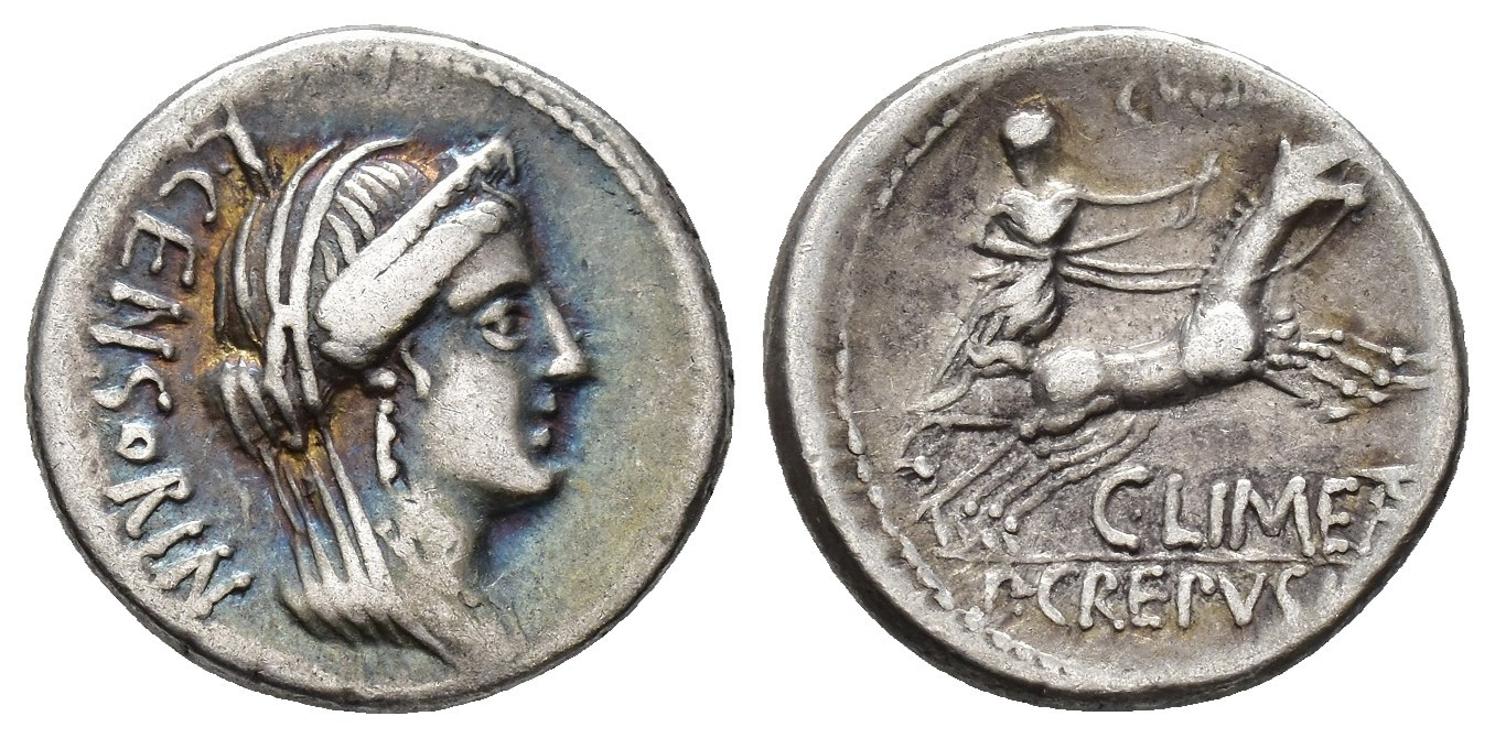 REPÚBLICA ROMANA. MARCIA. L. Marcius Censorinus. Denario. Roma (88 a.C.). A/ Cabeza de Venus a der.; L CENSORIN. R/ Victoria en biga a der., encima C(...); C LIMETA/ P CREPVSI. AR 3,84 g. 18,1 mm. CRAW-360.1; FFC-884. MBC.
