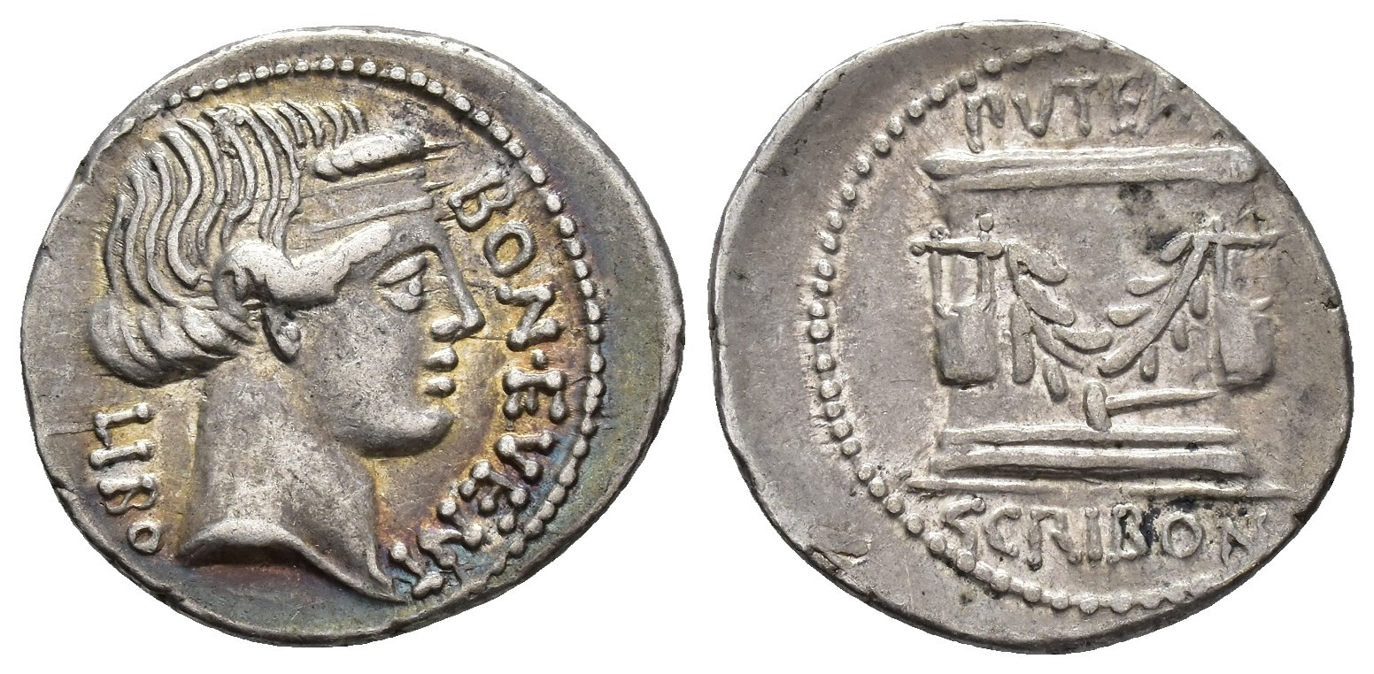 REPÚBLICA ROMANA. SCRIBONIA. L. Scribonius Libo. Denario. Roma (62 a.C.). A/ Cabeza de Bonus Eventus a der.; LIBO BON EVENT. R/ Pozo escriboniano decorado con un martillo en su base; PVTEAL/SCRIBON. AR 3,91 g. 21,1 mm. CRAW-416.1a; FFC-1102. Ligeramente descentrada. MBC+.