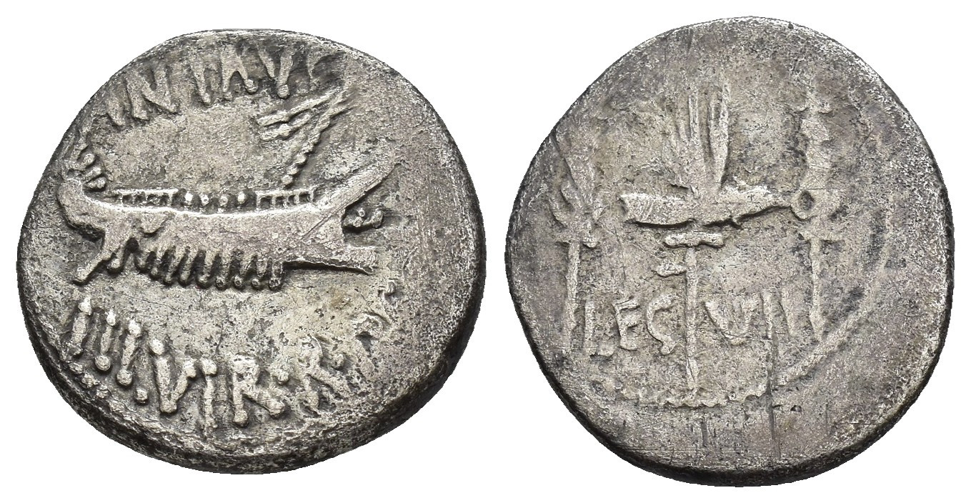 PERIODO DE JULIO CÉSAR A AUGUSTO. MARCO ANTONIO. Denario. Ceca móvil (32-31 a.C.). A/ Galera a der.; ANT AVG III VIR R P C. R/ Aquila entre dos signa; LEG-VII. AR 3,61 g. 18,5 mm. CRAW-544.20; FFC-38. Rayita. BC-.