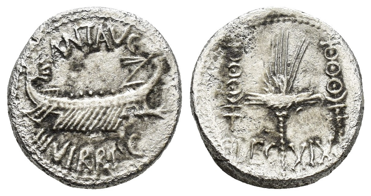 PERIODO DE JULIO CÉSAR A AUGUSTO. MARCO ANTONIO. Denario. Ceca móvil (32-31 a.C.). A/ Galera a der.; ANT AVG III VIR R P C. R/ Aquila entre dos signa; LEG-XIX. AR 3,09 g. 16,6 mm. CRAW-544.35; FFC-58. Oxidaciones limpiadas. MBC/MBC-.