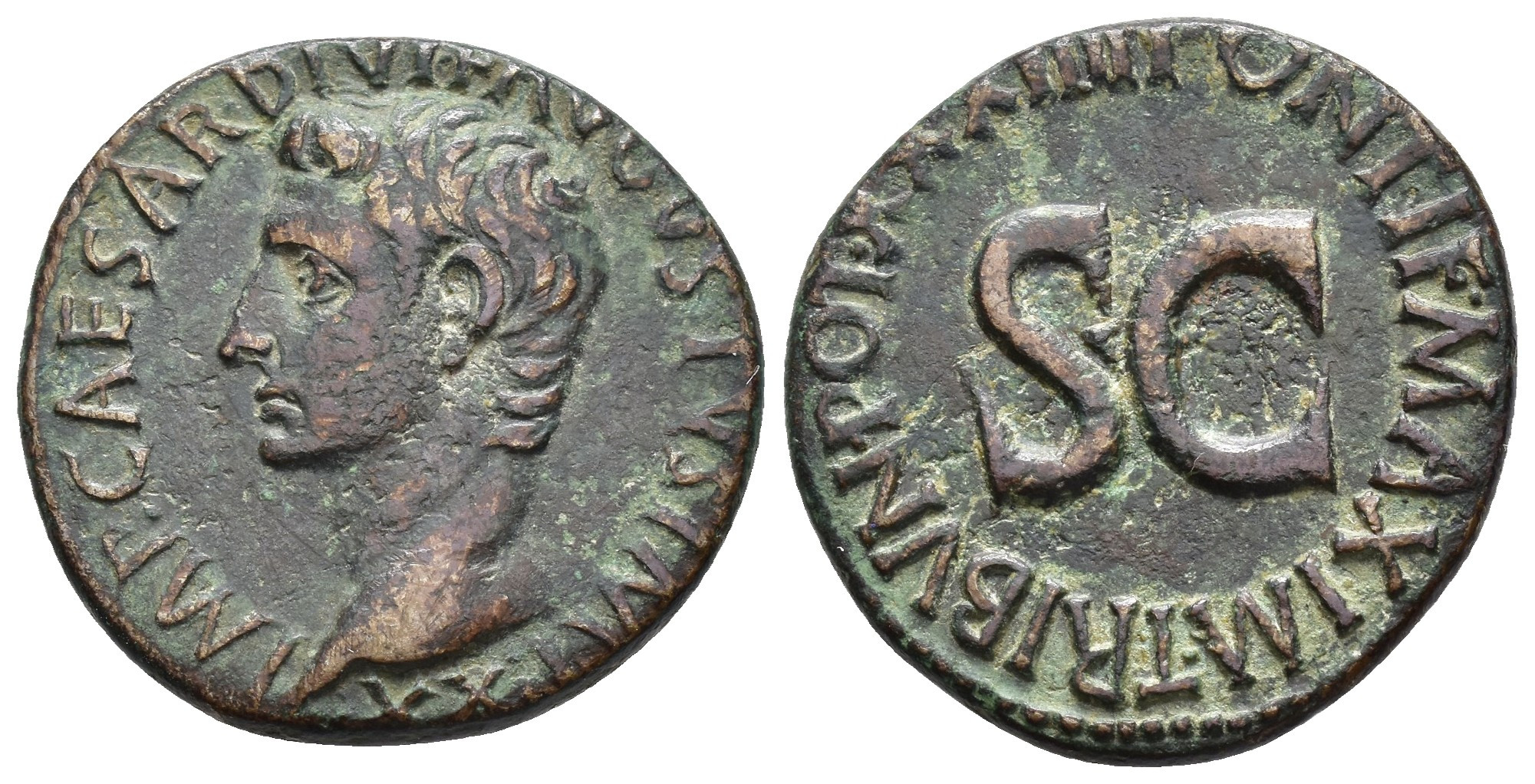 PERIODO DE JULIO CÉSAR A AUGUSTO. AUGUSTO. As. Roma (11-12 d.C.). A/ Cabeza a izq.; IMP CAESAR DIVI F AVGVSTVS IMP XX. R/ S C, alrededor PONTIF MAXIM TRIBVN POT XXXIIII. AE 10,9 g. 26,1 mm. RIC-471 Pequeñas marcas. MBC.