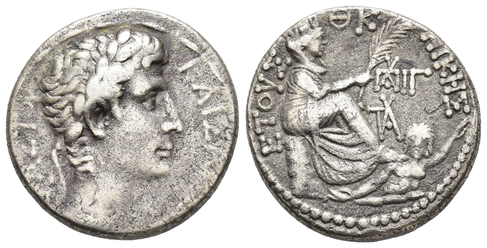 PERIODO DE JULIO CÉSAR A AUGUSTO. AUGUSTO. Antioquía del Orontes. Tetradracma (año 29/2 a.C.). A/ Cabeza laureada a der.; ΚΑΙΣΑΡΟΣ ΣΕΒΑΣΤΟY. R/ Tyche sentada a der., debajo el Orontes AR 15,04 g. 25,1 mm. RPC-I.4155. Porosidades. MBC-.