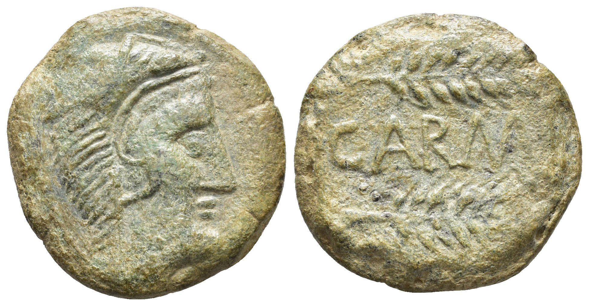 HISPANIA ANTIGUA. CARMO. As. A/ Cabeza de Hércules con leonté a der. R/ Dos espigas a der., en medio CARMO. AR 14,94 g. 26,7 mm. I-466; ACIP-2395; CC-3458, mismo ejemplar. Pátina verde claro. MBC. Rara.