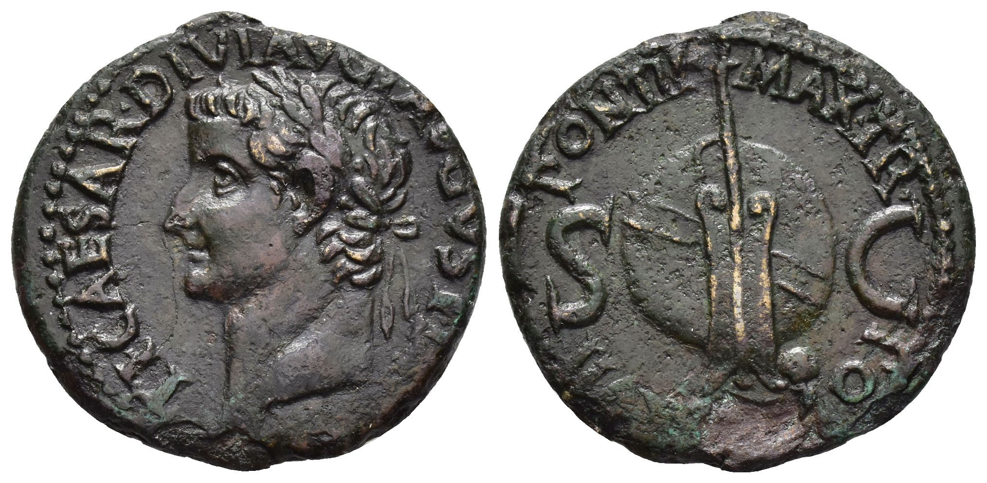 IMPERIO ROMANO. TIBERIO. As. Roma (36-37). A/ Cabeza laureada a izq.; TI CAESAR DIVI AVG F AVGVST I(MP). R/ Timón delante de globo con banda transversal y orbe en su base; PONTIF MAX TR PO(T XXXV)II, S-C. AE 9,21 g. 26,6 mm. RIC-18 MBC+/MBC.
