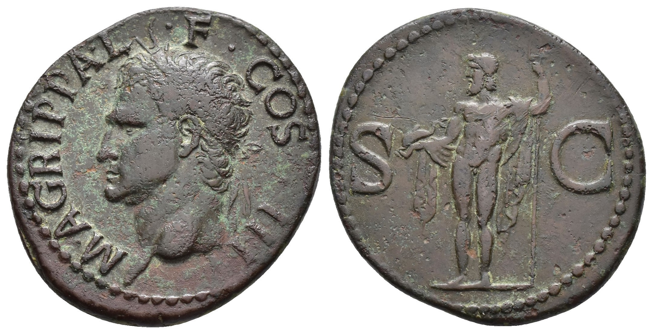 IMPERIO ROMANO. AGRIPA (bajo Calígula). As. (37-41 d.C.). A/ Cabeza con corona rostral a izq.; M AGRIPPA L F COS III. R/ Neptuno con delfín y tridente; S-C. AE 11,71 g. 29,7 mm. RIC-58. Pequeñas marcas. Pátina verde. MBC/MBC-.