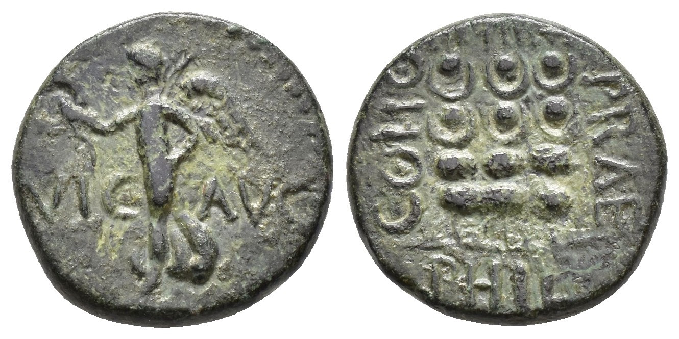 IMPERIO ROMANO. CLAUDIO I. AE. Philippi (Macedonia) (Época de Claudio o Nerón). A/ Victoria avanzando a izq.; VIC-AVG. R/ Tres estandartes; COHO(R)) PRAE PHIL. AE 4,66 g. 17,9 mm. RPC-I.1651. Pátina verde. MBC-/MBC.
