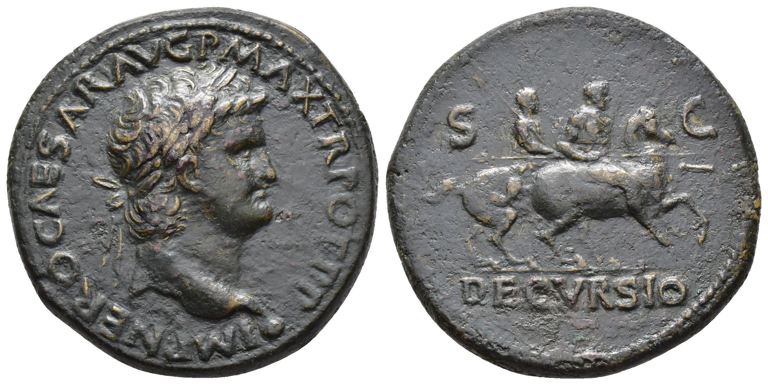 IMPERIO ROMANO. NERÓN. Sestercio. Lugdunum (62-68 d.C.). A/ Cabeza laureada a der.; IMP NERO CAESAR AVG P MAX TR POT P P. R/ Nerón con lanza cabalgando a der. con otro jinete; S C., exergo DECVRSIO. AE 25,45 g. 34,8 mm. RIC-581. Campos repasados. Pátina verde. MBC/MBC-.