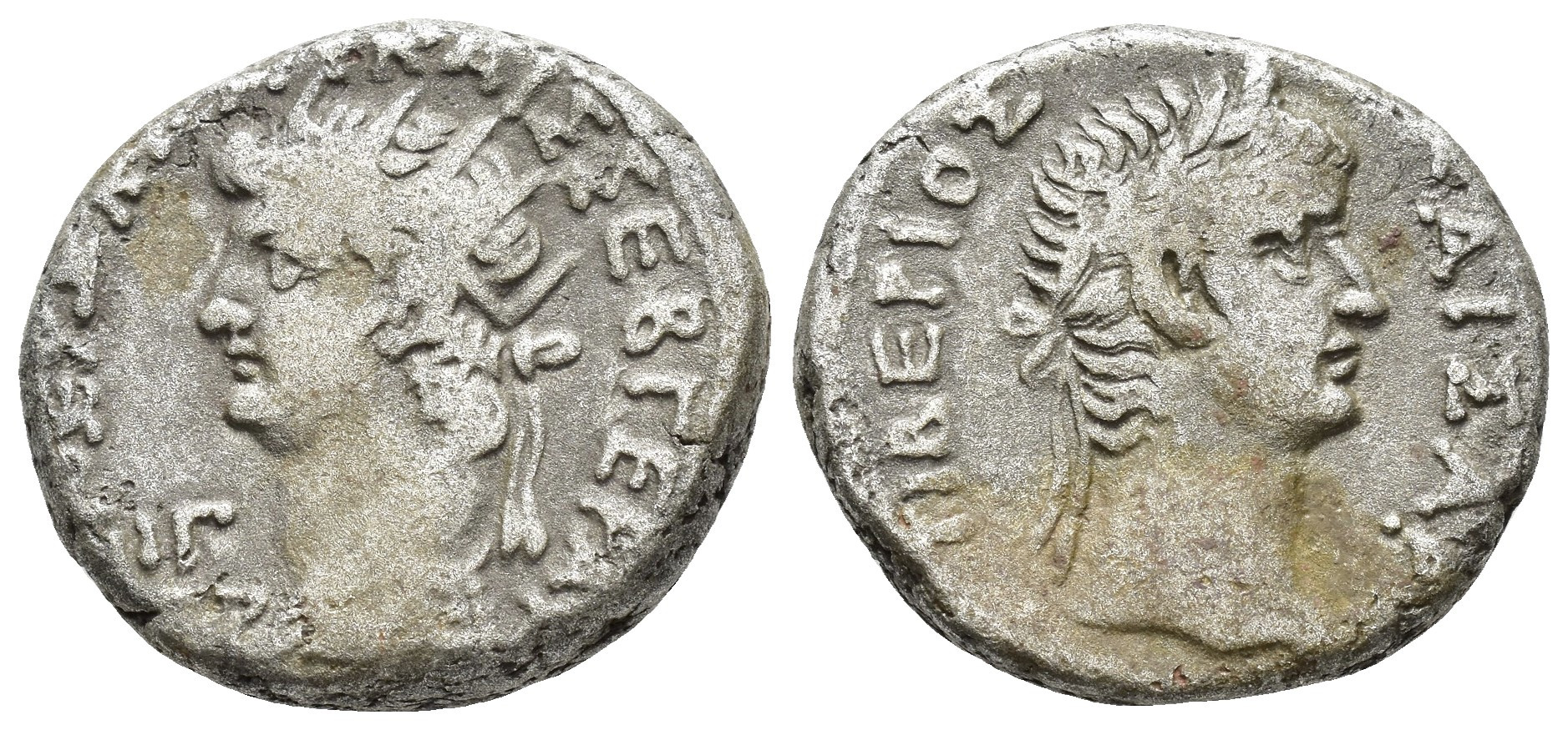IMPERIO ROMANO. NERÓN. Tetradracma. Alejandría (66-67 d.C.). A/ Cabeza radiada y con égida a izq., delante(L) ΙΓ (año 13), alrededor (Ν)ΕΡΩ Κ(ΛΑΥ) ΚΑΙΣ ΣΕΒ ΓΕΡ ΑΥ, R/ Cabeza laureada de Tiberio a der.; ΤΙΒΕΡΙΟΣ (Κ)ΑΙΣΑΡ. VE 13,25 g. 22,6 mm. RPC-I.5295. MBC-.