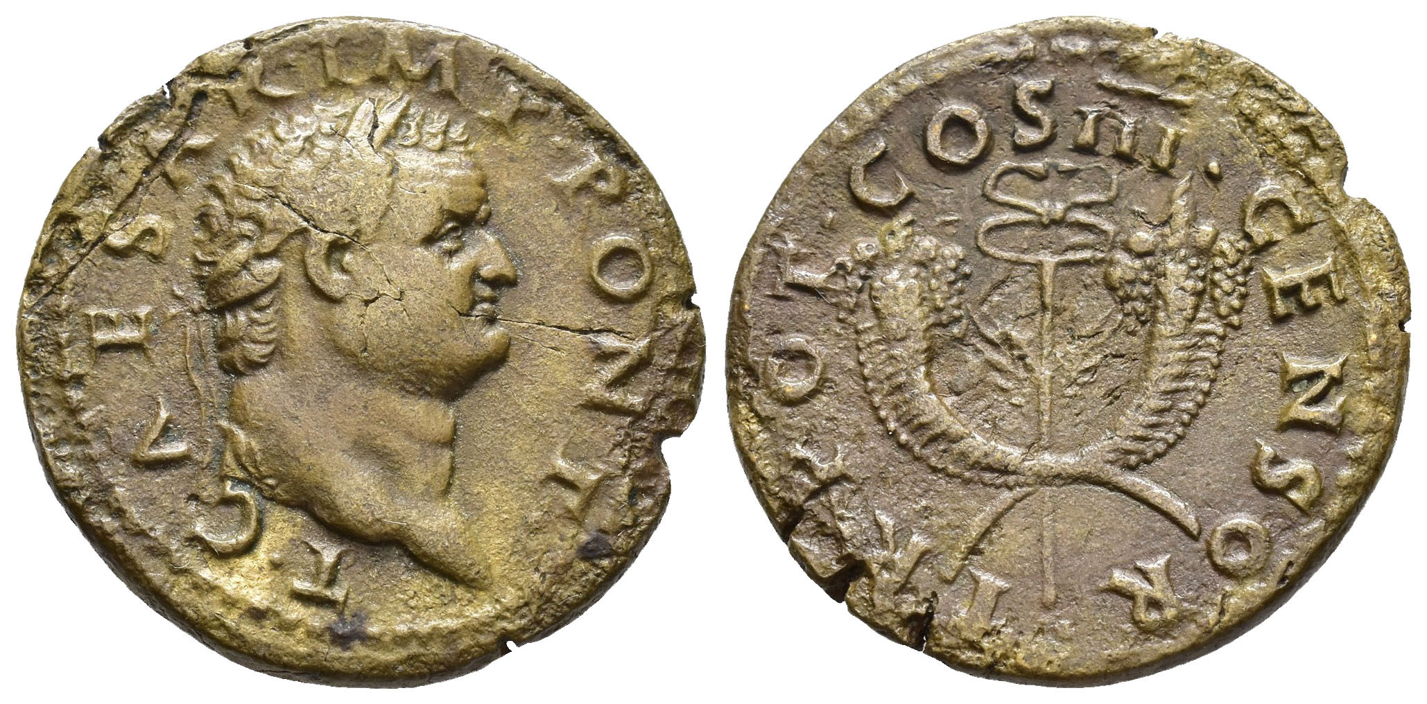 IMPERIO ROMANO. TITO. Dupondio. Roma (74 d.C.). A/ Cabeza laureada a der.; T CAESAR IMP PONT. R/ Dos cornucopias cruzadas, en medio caduceo alado; TR POT COS III CENSOR. AE 11,59 g. 27,2 mm. RIC-762. Defectos de acuñación y erosiones. MBC/MBC+.
