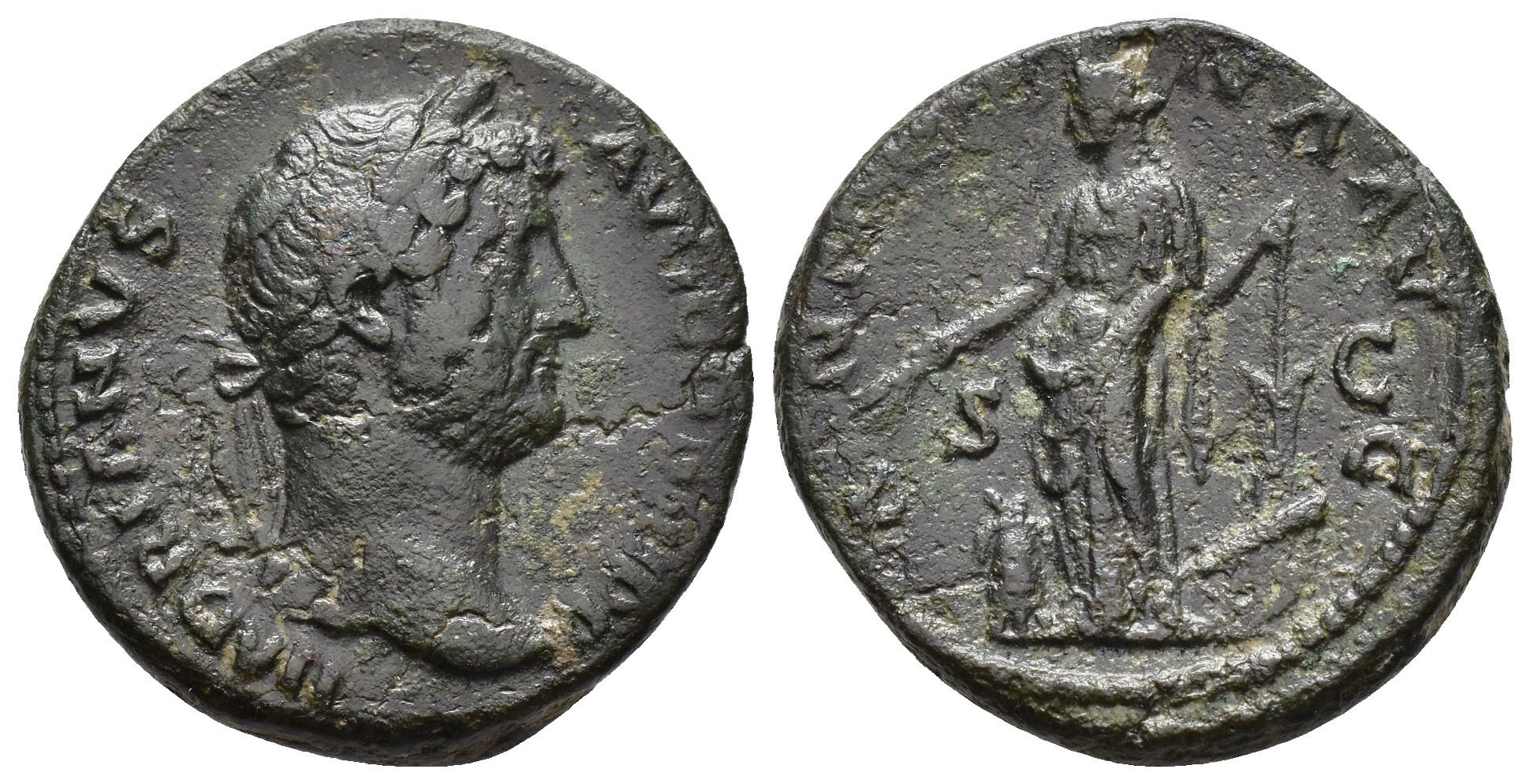 IMPERIO ROMANO. ADRIANO. Roma (133-135). As. A/ Cabeza laureada a der.; HADRIANVS AVG COS III P P. R/ Annona a izq. con espigas y timón sobre proa, a sus pies modio; ANNONA AVG, S-C. AE 10,46 g. 26,4 mm. RIC-2143. Defecto de cospel en anv. Pátina oscura. MBC-.