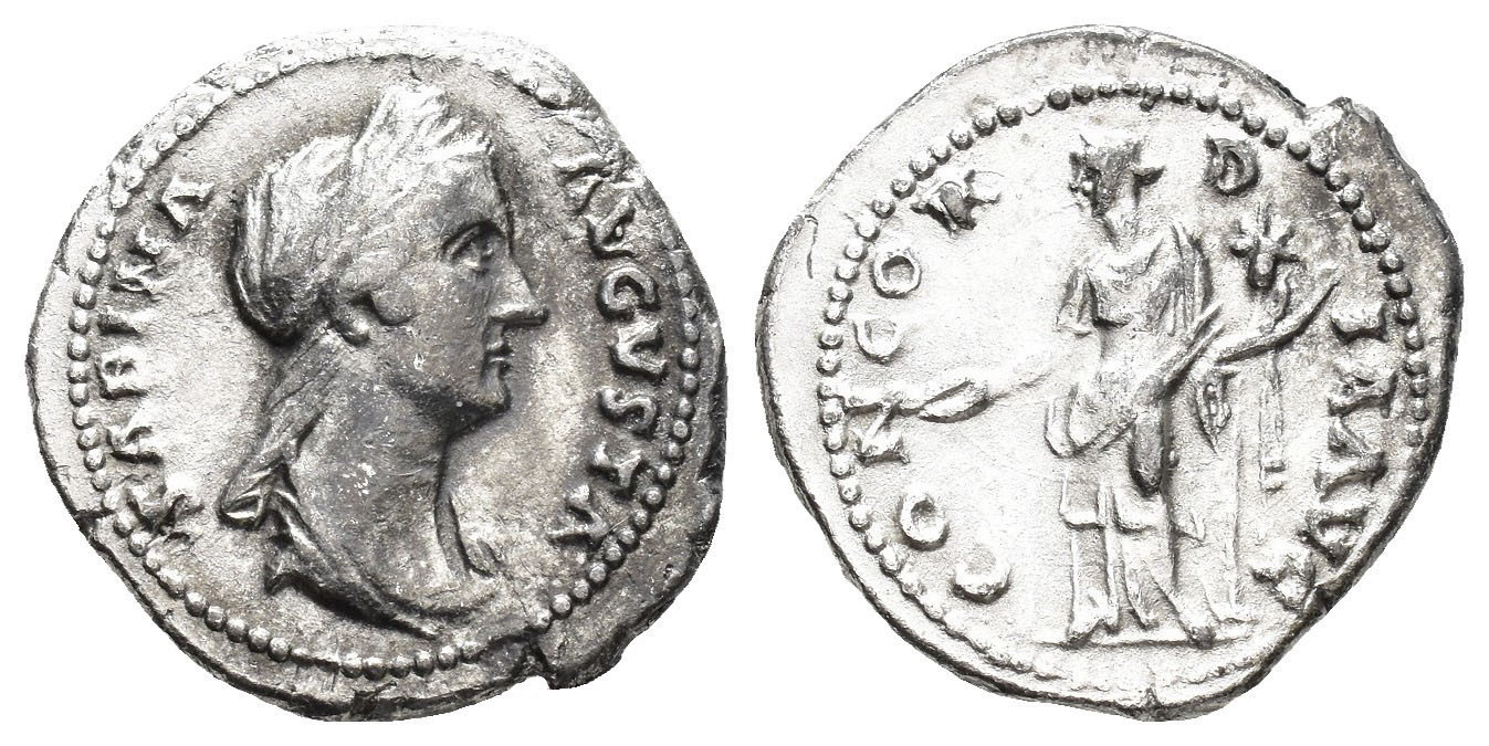 IMPERIO ROMANO. SABINA. Denario. Roma (136-138). A/ Busto diademado con estéfane y drapeado a der.; SABINA AVGVSTA. R/ Concordia a izq. con pátera y cornucopia, apoyada en columna; CONCORDIA AVG. AR 3,62 g. 17,7 mm. RIC-2571. Oxidaciones limpiadas. MBC.