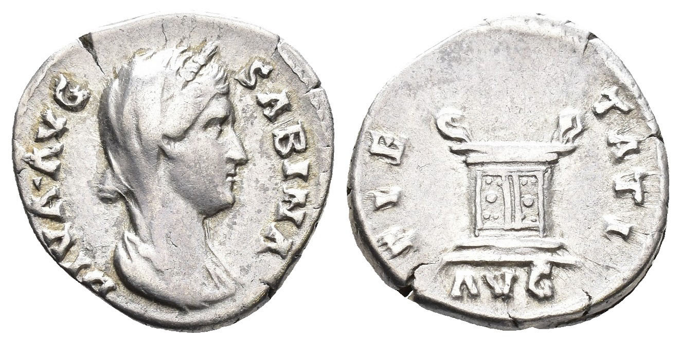 IMPERIO ROMANO. SABINA. Denario. Roma (138). A/ Busto velado y coronado de espigas a der.; DIVA AVG SABINA. R/ Ustrino; PIETATI AVG. AR 3,39 g. 17,7 mm. RIC-2607. Cospel abierto. MBC-/MBC. Escasa.