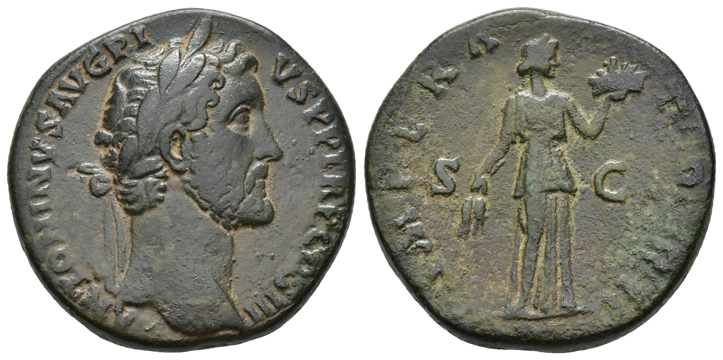 IMPERIO ROMANO. ANTONINO PÍO. Sestercio. Roma (143-144). A/ Cabeza laureada a der.; ANTONINVS AVG PIVS P P TR P COS III. R/ Fides a der. con espigas y cesta de frutas; IMPERATOR II, S C. AE 22,89 g. 30,7 mm. RIC-716A. Pátina oscura. MBC/MBC-.