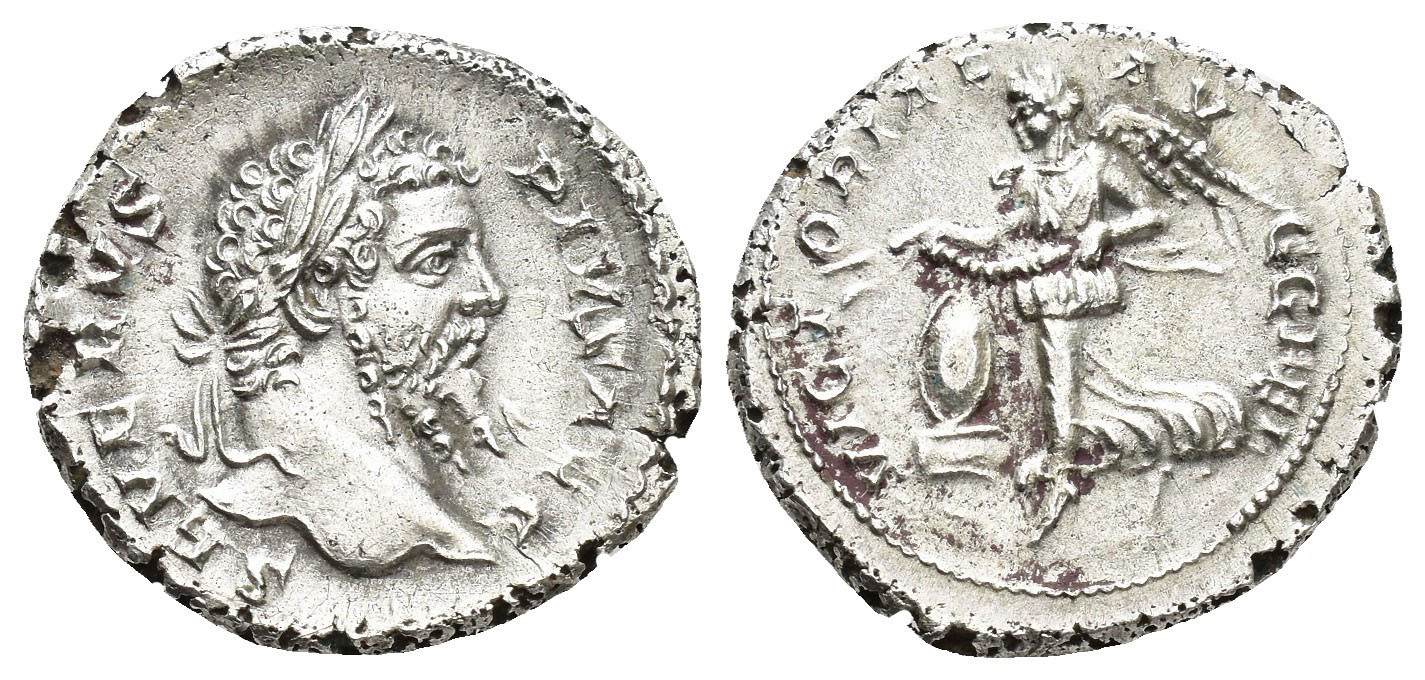 IMPERIO ROMANO. SEPTIMIO SEVERO. Denario forrado. ¿Laodicea? A/ Cabeza laureada a der.; SEVERVS PIVS AVG. R/ Victoria volando a izq. con guirnalda sobre escudo; VICTORIAE AVGG FEL. AR 3,43 g. 17,7 mm. RIC-no. Posible denario híbrido: anv. emisión post. 202 d.C., rev. RIC-516 (198-202 d.C.) . EBC-.