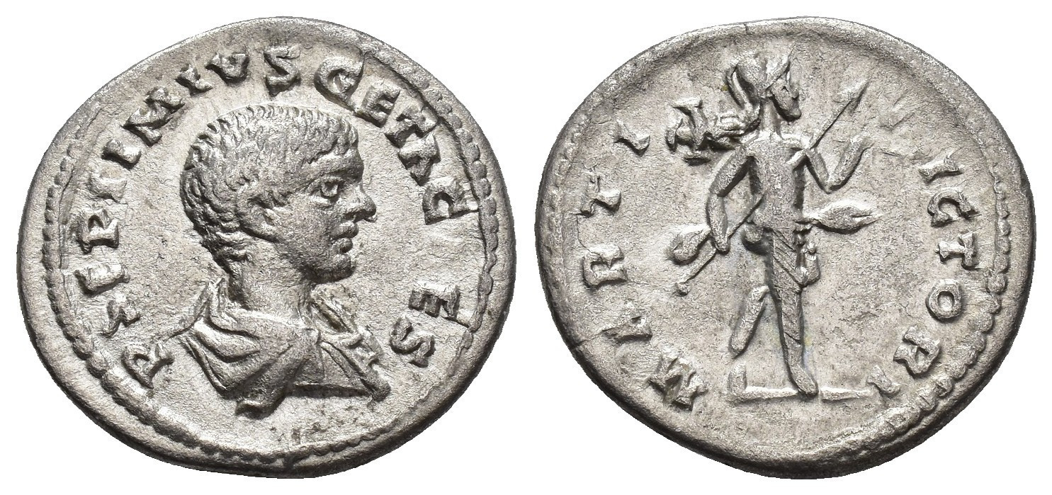 IMPERIO ROMANO. GETA. Denario. Laodicea (203). A/ Busto drapeado a der.; P SEPTIMIVS GETA C(A)ES. R/ Marte con lanza y trofeo a der.; MARTI VICTORI. AR 3,06 g. 19,8 mm. RIC-103. MBC.