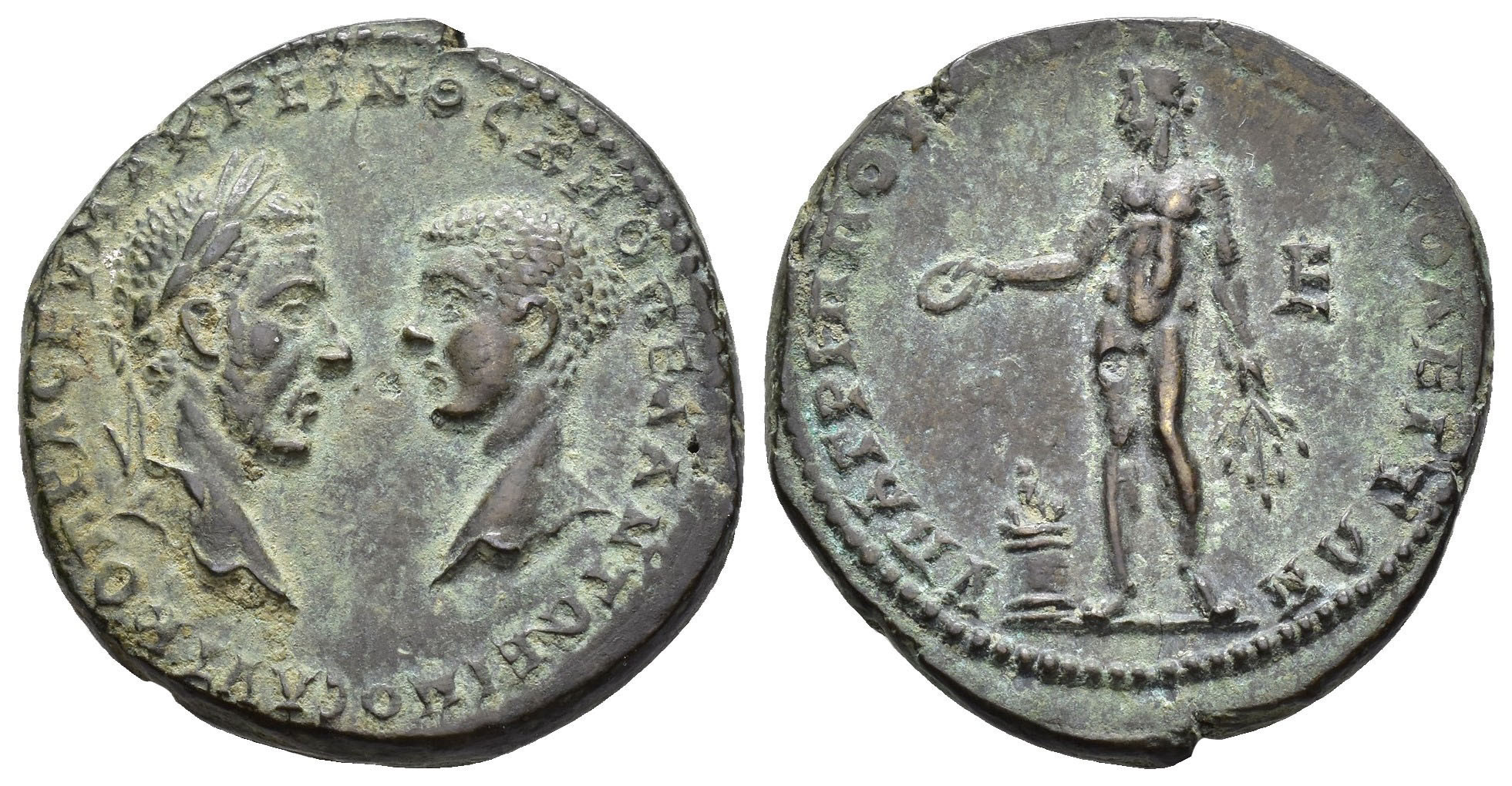 IMPERIO ROMANO. MACRINO Y DIADUMENIANO. 5 assaria. Marcianópolis (Moesia) (217-218). A/ Bustos afrontados de Macrino y Diadumeniano; alrededor ley. griega. R/ Apolo a izq. con rama y pátera, delante altar; alrededor ley. griega. AE 11,67 g. 27 mm. COP-22. Pátina verde. MBC+.