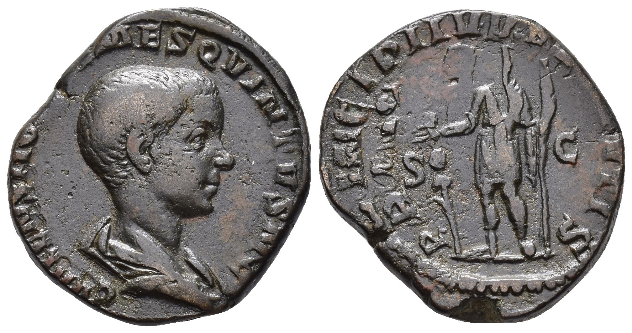 IMPERIO ROMANO. HOSTILIANO. Sestercio. Roma (251). A/ Busto drapeado a der.; C VALENS HO(STIL) MES QVINTVS N C. R/ Hostiliano en traje militar a izq. con lanza y estandarte; (PRI)NCIPI IVVEN(TV)TIS, S-C. AE 15,8 g. 28,3 mm. RIC-216.