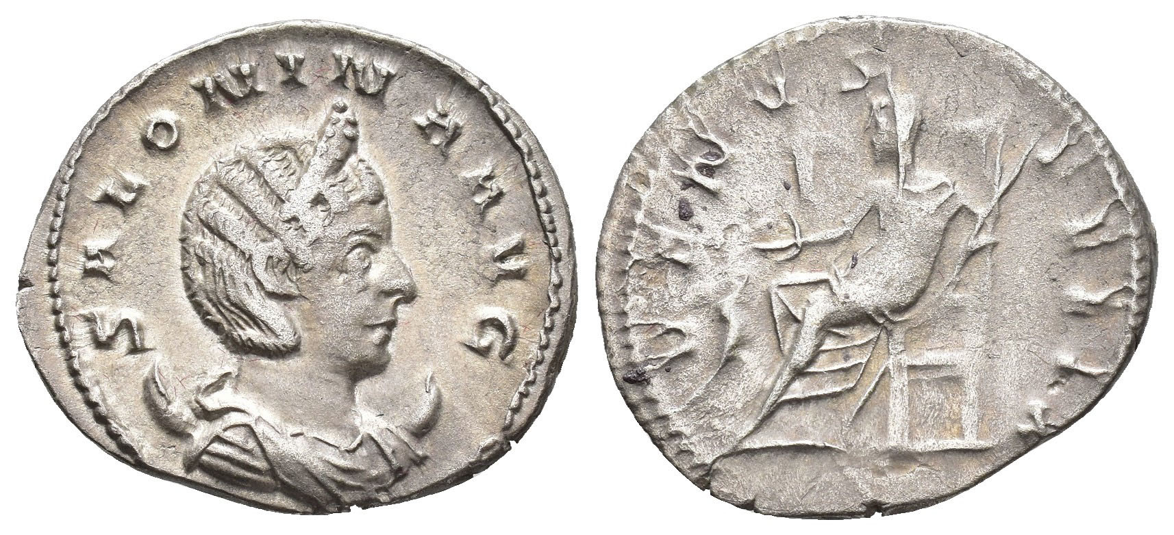 IMPERIO ROMANO. SALONINA. Antoniniano. Lugdunum (257-258). A/ Busto diadema y drapeado sobre creciente a der.; SALONINA AVG. R/ Venus sentada a izq, con manzana y cetro, a sus pies cautivo; VENVS FELIX. VE 3,38 g. 203 mm. RIC-7. MBC/MBC-.