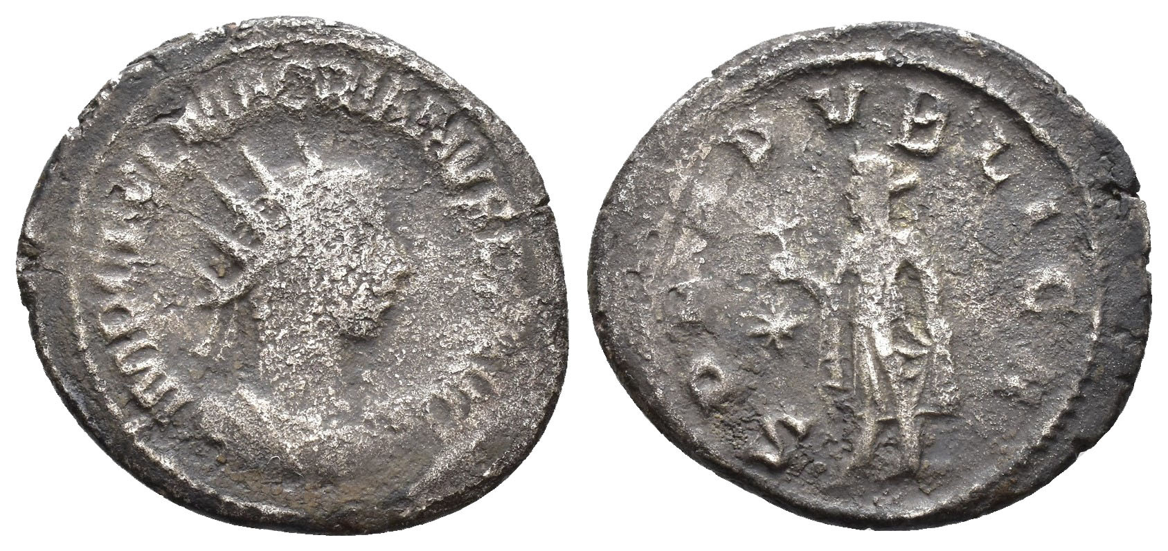 IMPERIO ROMANO. MACRIANO. Antoniniano. Antioquía (260-261). A/ Busto radiado y drapeado a der.; IMP C FVL MACRIANVS P F AVG. R/ Spes avanzando a der. con flor y sujetándose el vestido, en campo estrella; SPES PVBLICA. VE 3,45 g. 20,9 mm. RIC-13. Erosiones. BC+. Escasa.