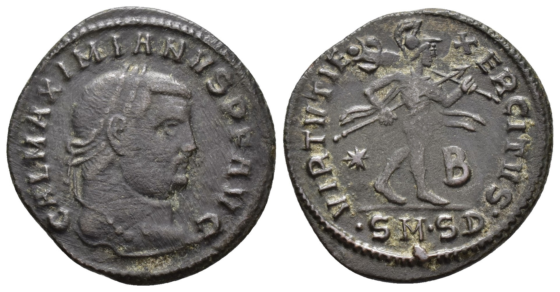IMPERIO ROMANO. GALERIO MAXIMIANO. Follis. Serdica (307-308). A/ Cabeza laureada a der.; GAL MAXIMIANVS P F AVG. R/ Virtus avanzando a der. con lanza y trofeo VIRTVS EXERCITVS. */B//.SM.SD. AE 5,63 g. 26,9 mm. RIC-44. MBC-.