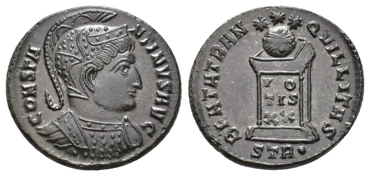 IMPERIO ROMANO. CONSTANTINO I. Follis. Treveris (322). A/ Busto con casco y coraza a der.; CONSTANTINVS AVG. R/ Globo sobre altar con inscripción VOT/IS/XX, encima tres estrellas. -/-//STR. AE 3,29 g. 18 mm. RIC-341. EBC.