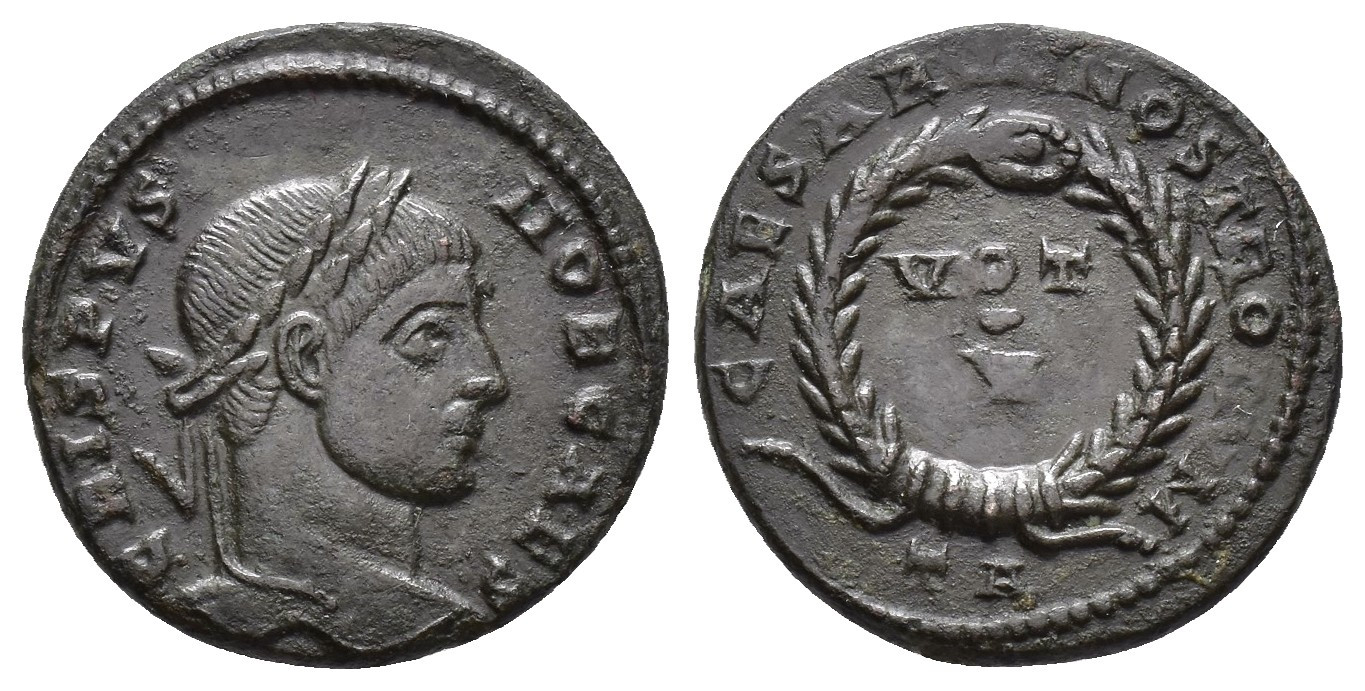 IMPERIO ROMANO. CRISPO. Follis. Arelate (321). A/ Cabeza laureada a der.; CRISPVS NOB CAES. R/ Láurea rodeanddo VOT/V; CAESARVM NOSTRORVM. -/-//TA. AE 2,89 g. 18,1 mm. RIC-230. EBC-/MBC+.