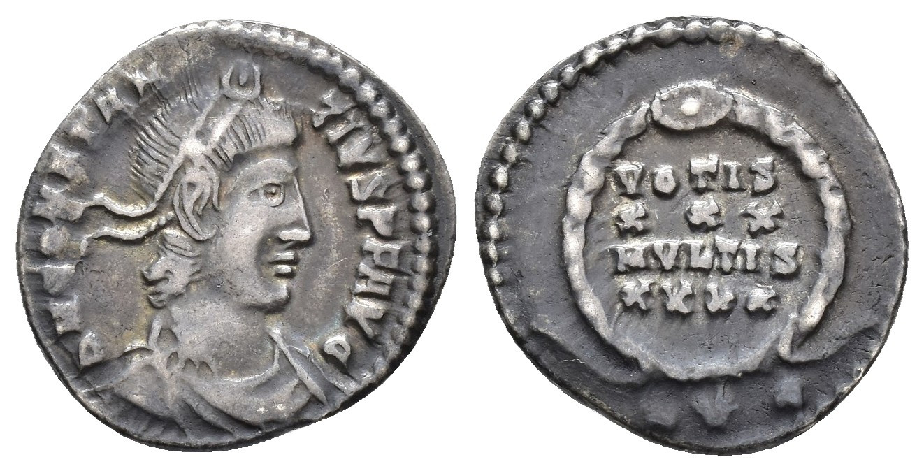 IMPERIO ROMANO. CONSTANCIO II. Silicua. Lugdunum (360-363). A/ Busto diademado, drapeado y acorazado a der.; D N CONSTANTIVS P F AVG. R/ Láurea rodeando VOTIS/XXX/MVLTIS/XXXX. -/-//LVG. AR 2,05 g. 18 mm. RIC-216. MBC-/MBC.