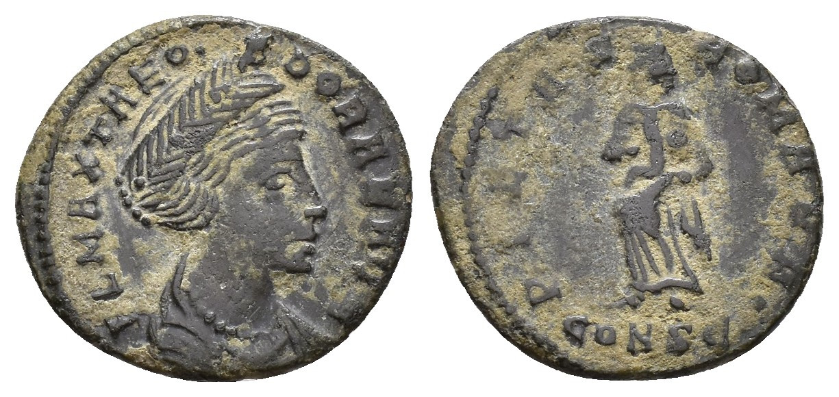 IMPERIO ROMANO. TEODORA. Follis. Constantinopolis (337-340). A/ Busto drapeado y con collar a der.; FL MAX THEODORAE AVG. R/ Pietas a izq.; PIETAS ROMANA. -/-//CONSE. AE 1,39 g. 15,1 mm. RIC-36. Pátina verde. MBC/BC+.