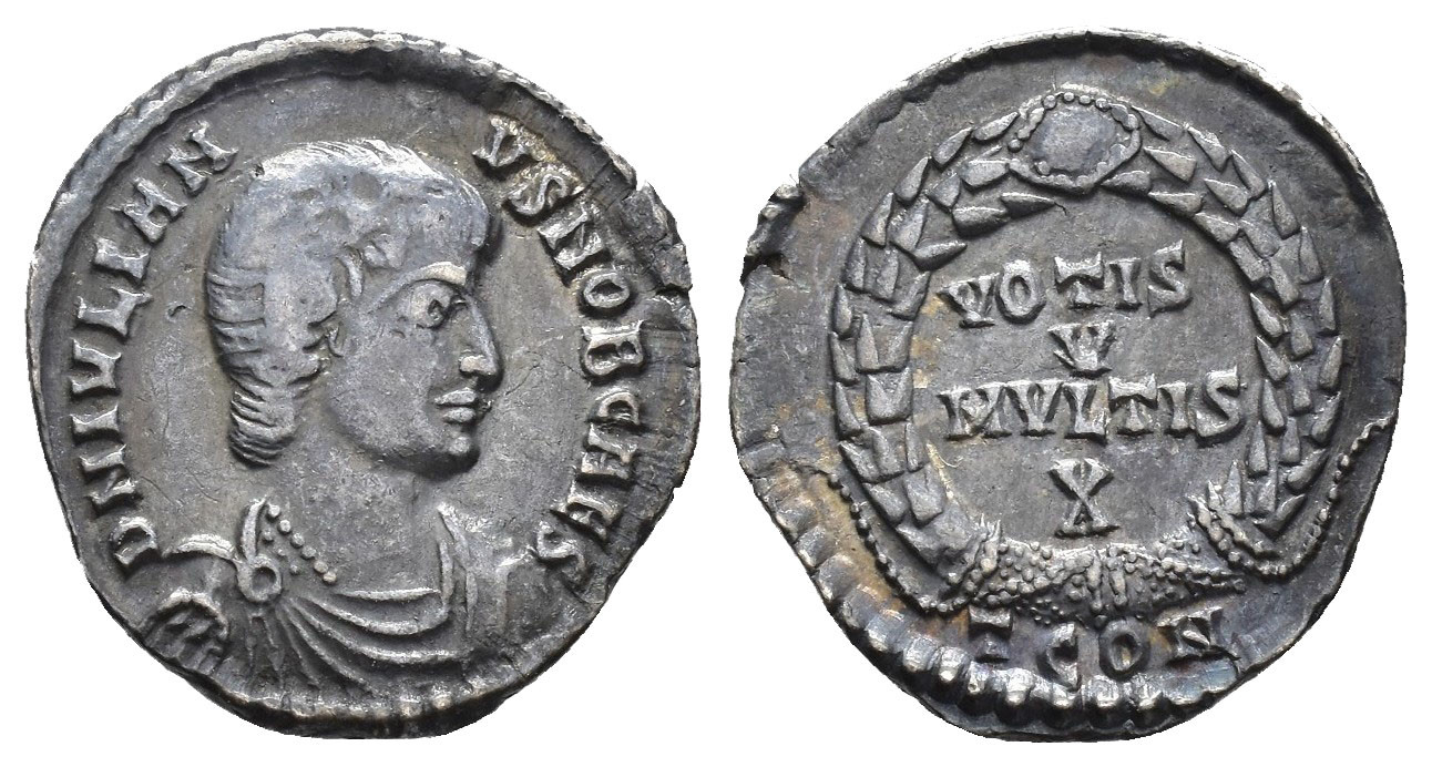 IMPERIO ROMANO. JULIANO II. Silicua. Arelate (355-360). A/ Busto drapeado y acorazado a der.; D N IVLIANVS NOB CAES. R/ Láurea rodeando VOTIS/V/MVLTIS/X. -/-//TCON. AR 1,88 g. 18,4 mm. RIC-263. Marquitas. MBC-/MBC.