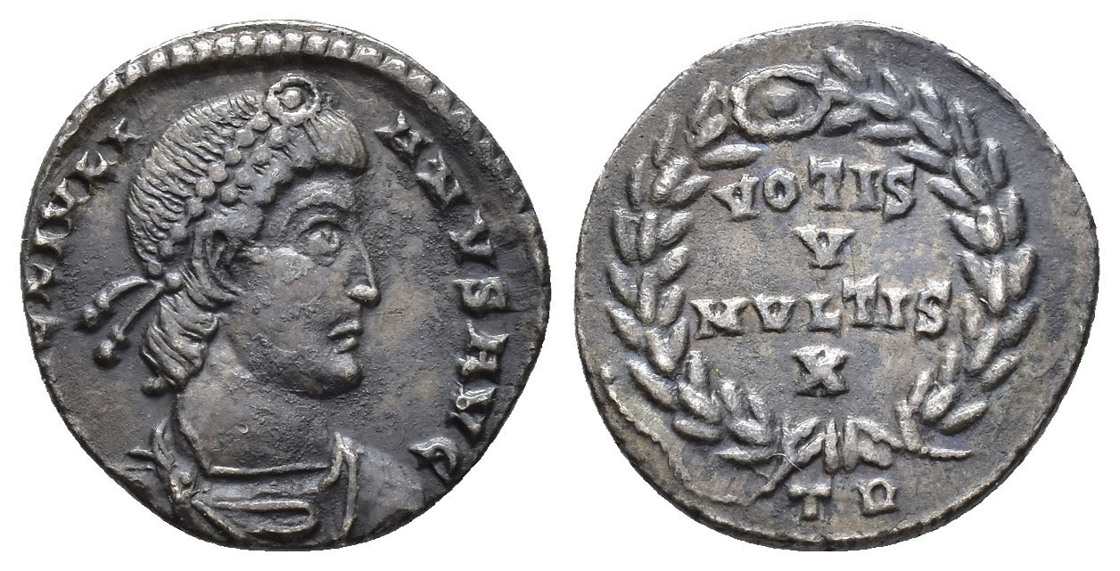 IMPERIO ROMANO. JULIANO II. Silicua. Treveris (360-363). A/ Busto diademado de perlas y drapeado a der.; (-- CL)IVLI-ANVS AVF. R/ Láurea rodeando VOTOS/V/MVLTIS/X.-/-// TR. AR 2,13 g. 16,9 mm. RIC-363-4. Leves concreciones. MBC/MBC+.